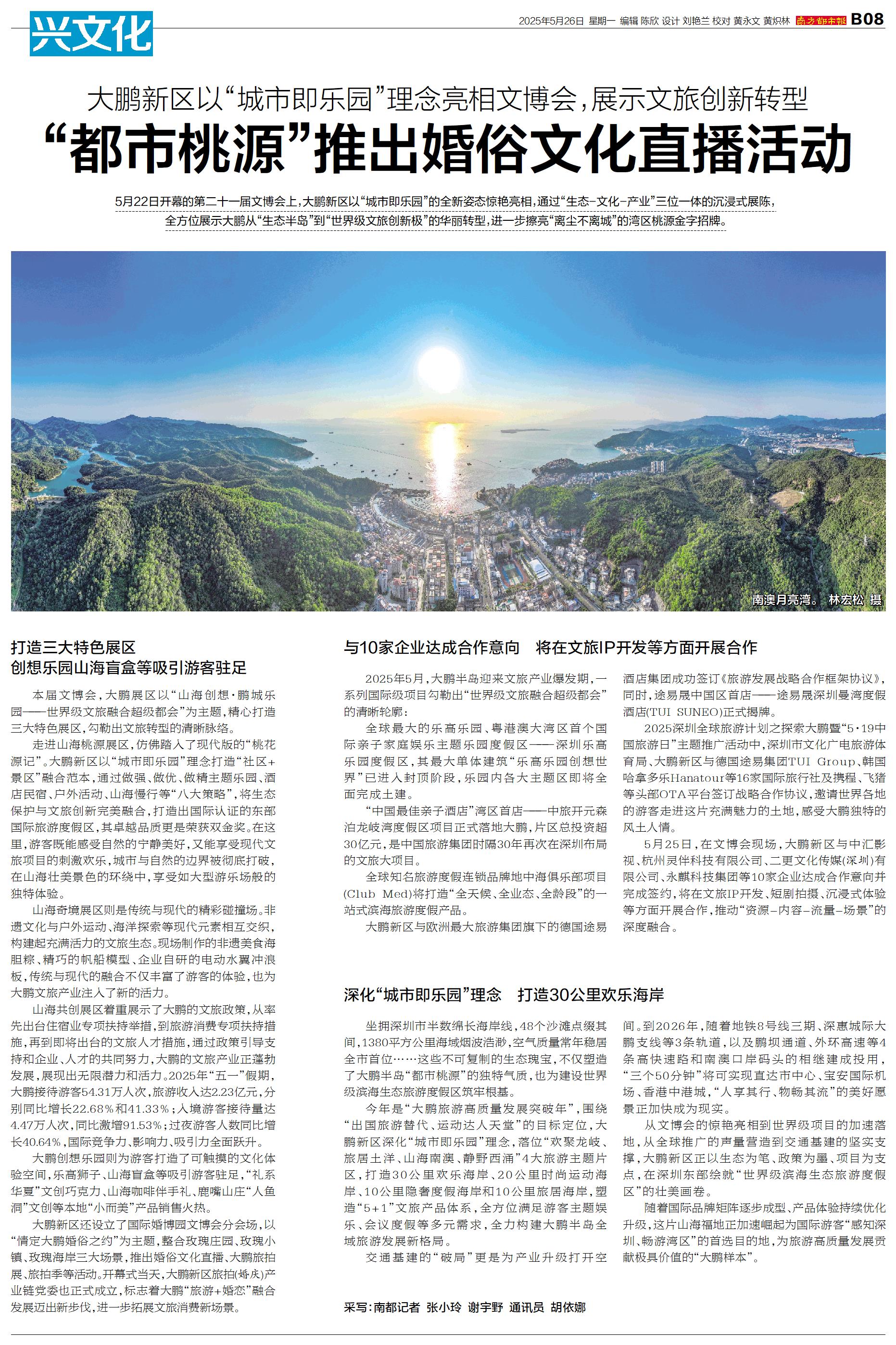 5月22日开幕的第二十一届文博会上,大鹏新区以“城市即乐园”的全新姿态惊艳亮相,通过“生态-文化-产业”三位一体的沉浸式展陈, 全方位展示大鹏从“生态半岛”到“世界级文旅创新极”的华丽转型,进一