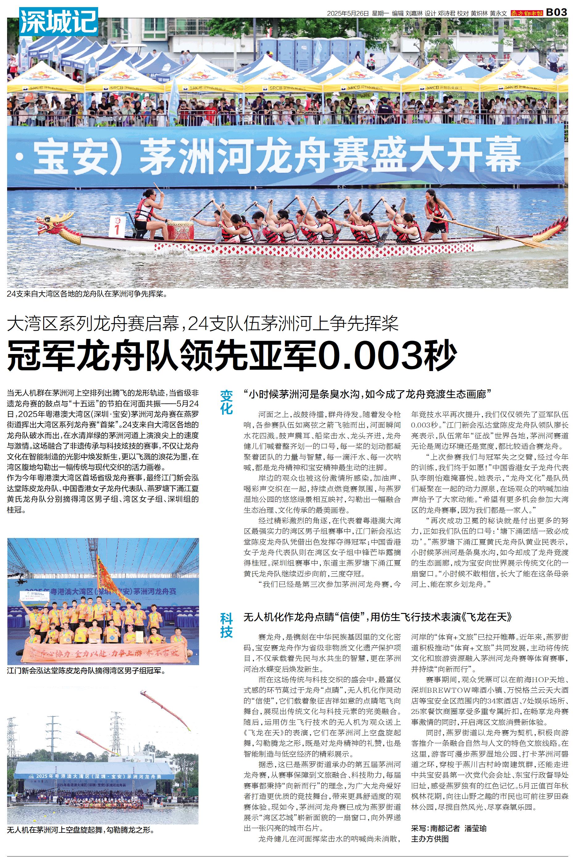 当无人机群在茅洲河上空排列出腾飞的龙形轨迹,当省级非遗龙舟赛的鼓点与“十五运”的节拍在河面共振——5月24日,2025年粤港澳大湾区(深圳·宝安)茅洲河龙舟赛在燕罗街道挥出大湾区系列龙舟赛“首桨”