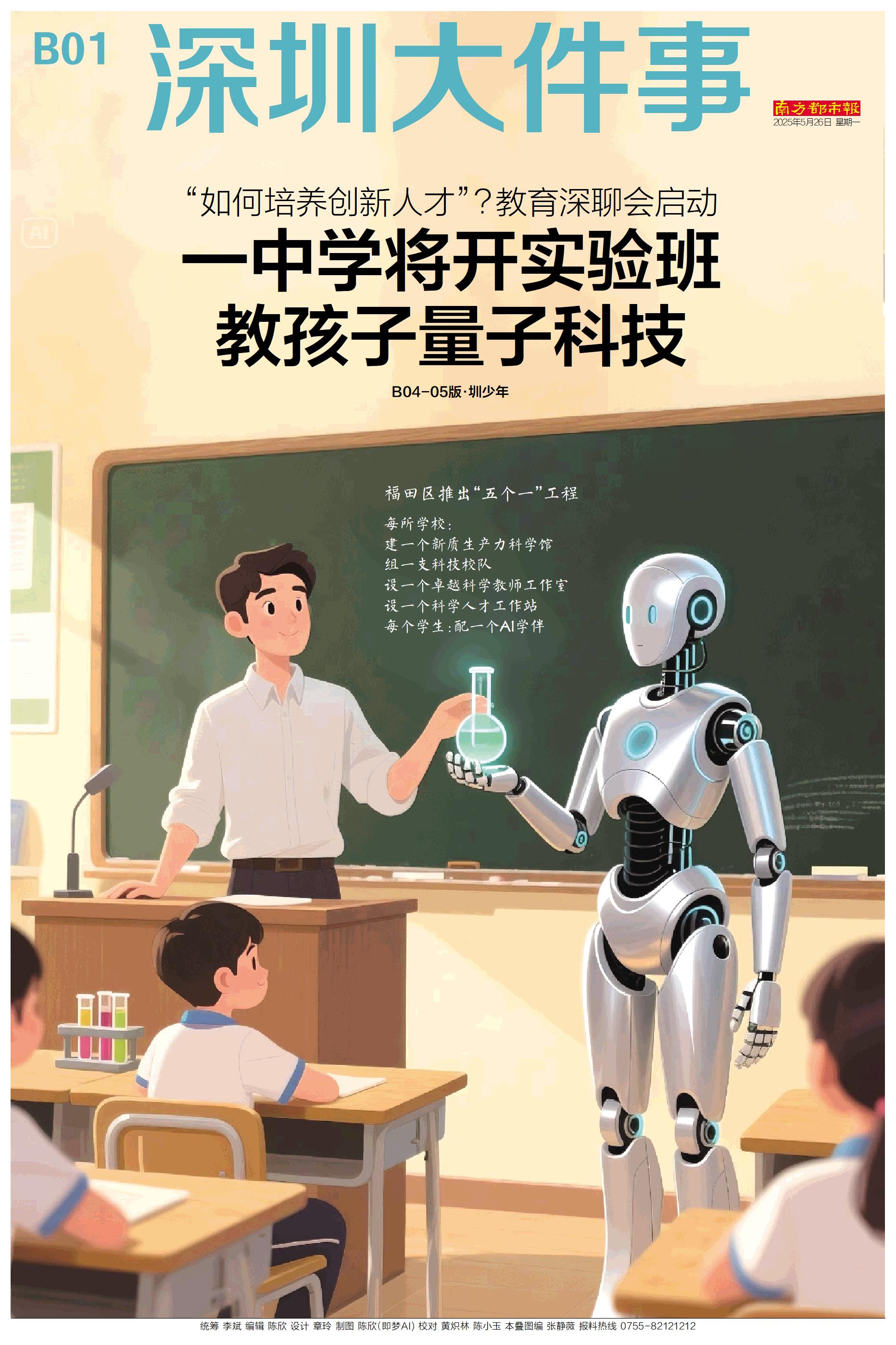 福田区推出“五个一”工程 每所学校: 建一个新质生产力科学馆 组一支科技校队 设一个卓越科学教师工作室 设一个科学人才工作站 每个学生:配一个AI学伴 B04-05版·圳少年