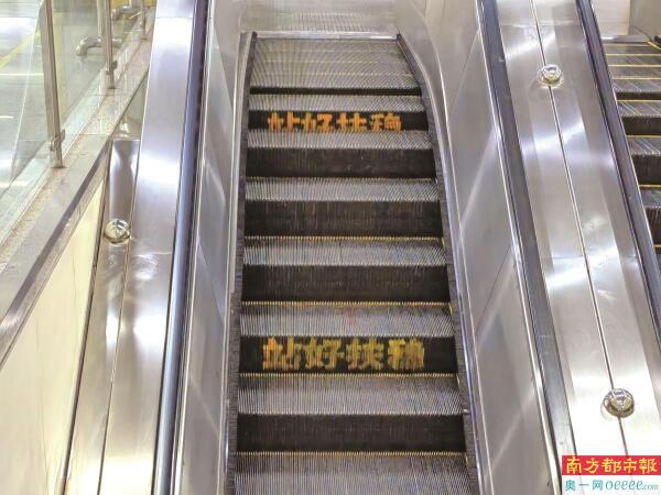 深圳地铁扶梯有“站好扶稳”字样提示。