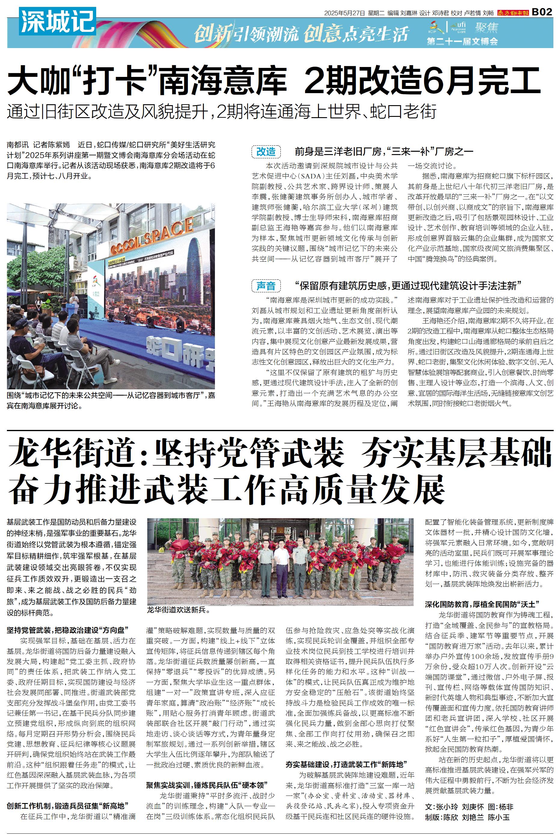 南都讯 记者陈紫嫣 近日,蛇口传媒/蛇口研究所“美好生活研究计划”2025年系列讲座第一期暨文博会南海意库分会场活动在蛇口南海意库举行。记者从该活动现场获悉,南海意库2期改造将于6月完工,预计七、
