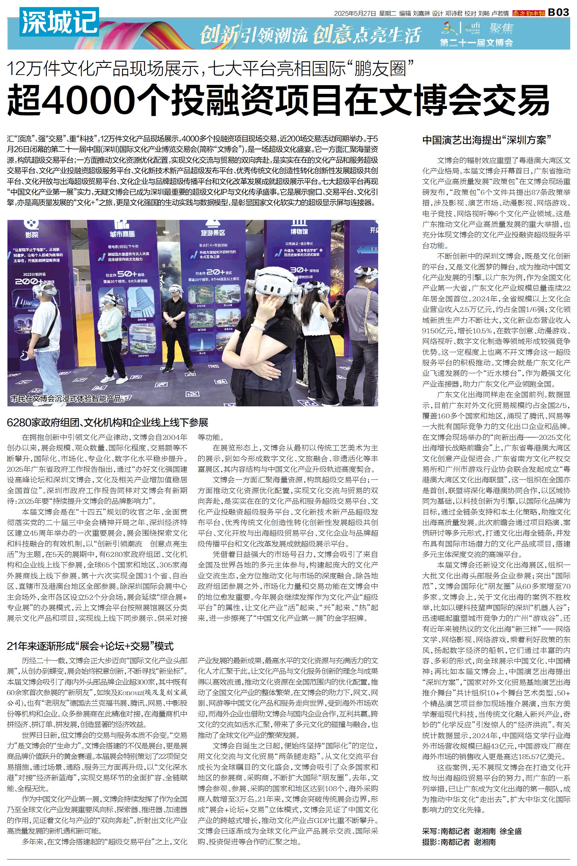 汇“顶流”、强“交易”、重“科技”,12万件文化产品现场展示,4000多个投融资项目现场交易,近200场交易活动同期举办。于5月26日闭幕的第二十一届中国(深圳)国际文化产业博览交易会(简称“文博