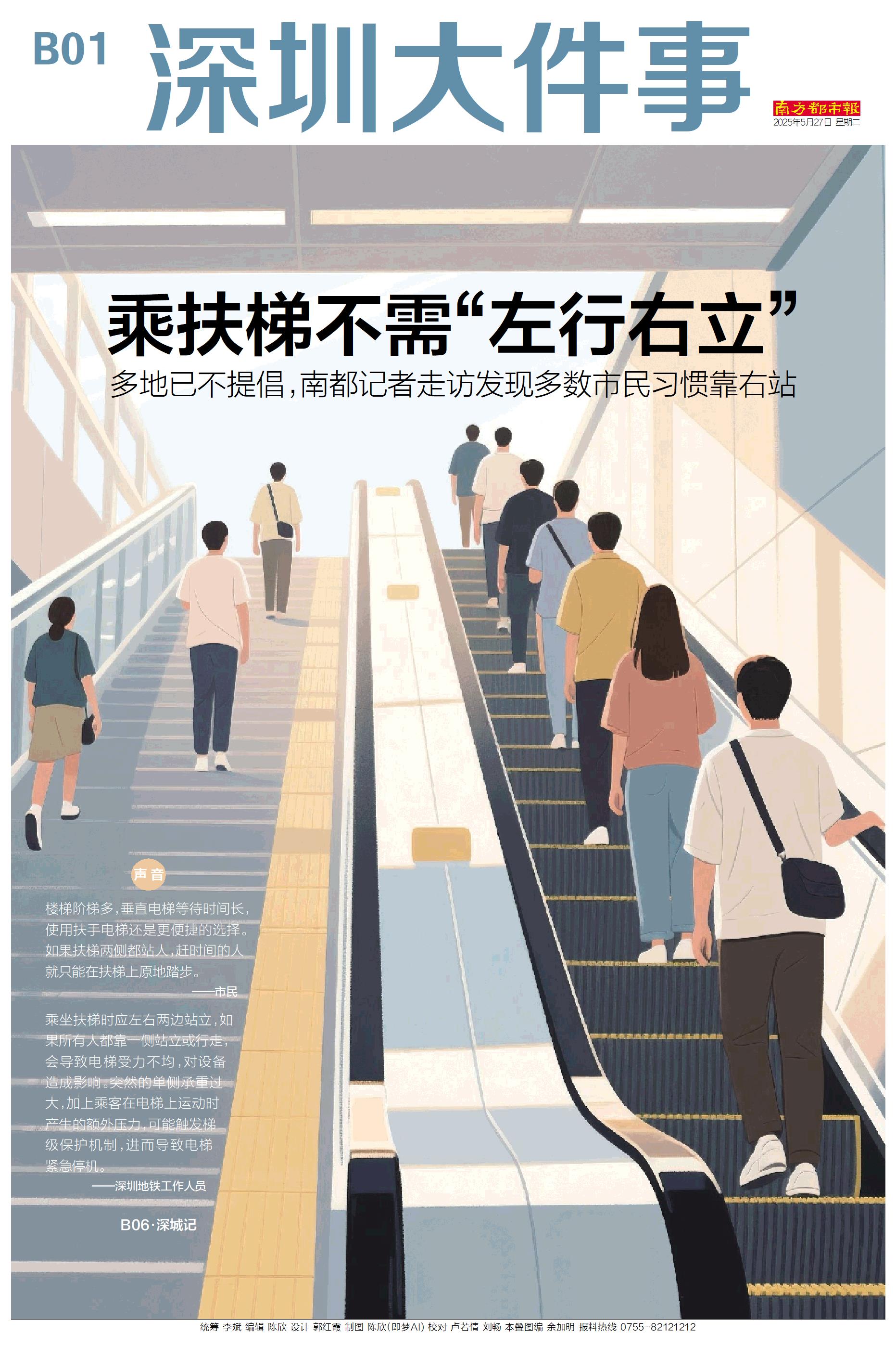 声 音 楼梯阶梯多,垂直电梯等待时间长,使用扶手电梯还是更便捷的选择。如果扶梯两侧都站人,赶时间的人就只能在扶梯上原地踏步。 ——市民 乘坐扶梯时应左右两边站立,如果所有人都靠一侧站