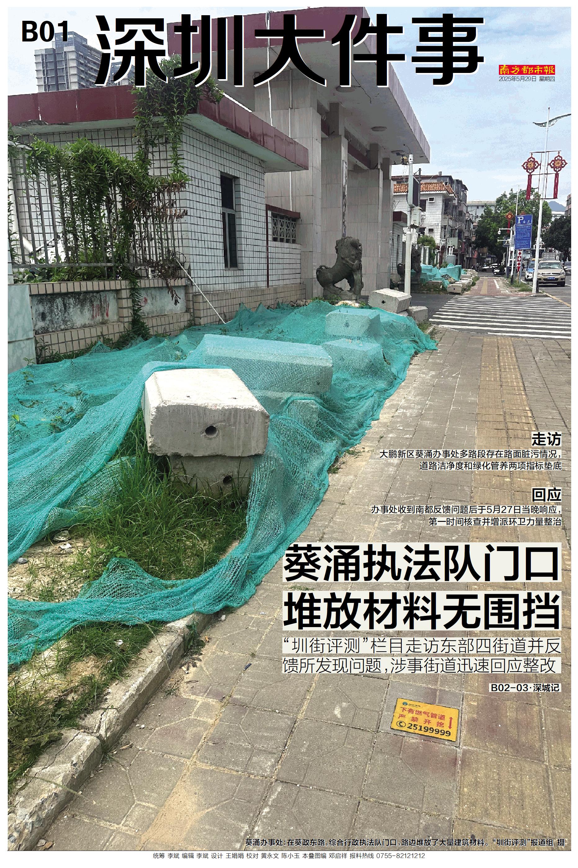 走访 大鹏新区葵涌办事处多路段存在路面脏污情况, 道路洁净度和绿化管养两项指标垫底 回应 办事处收到南都反馈问题后于5月27日当晚响应, 第一时间核查并增派环卫力量整治 B02-0