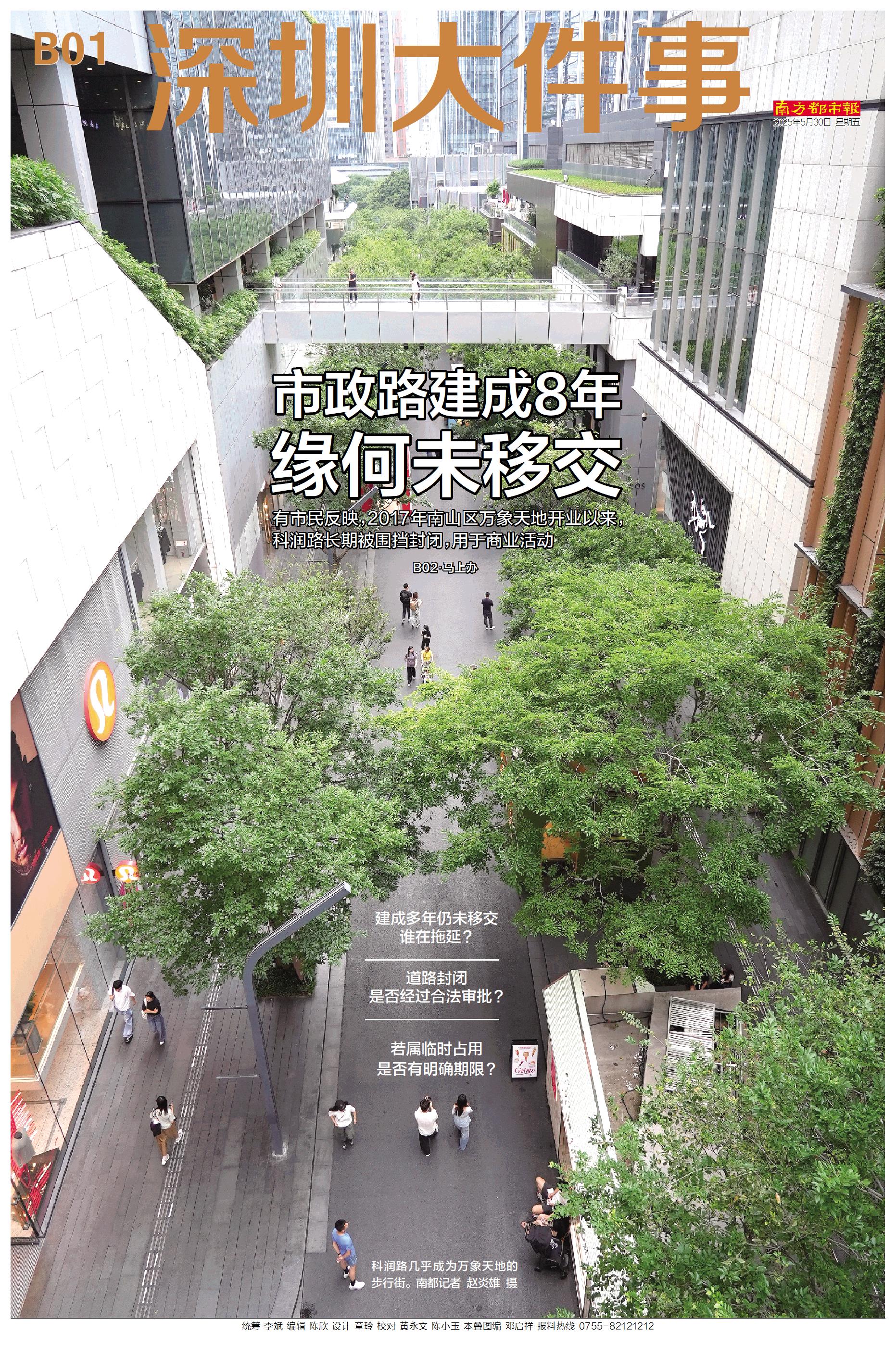 科润路几乎成为万象天地的步行街。 南都记者 赵炎雄 摄 建成多年仍未移交谁在拖延? 道路封闭是否经过合法审批? 若属临时占用是否有明确期