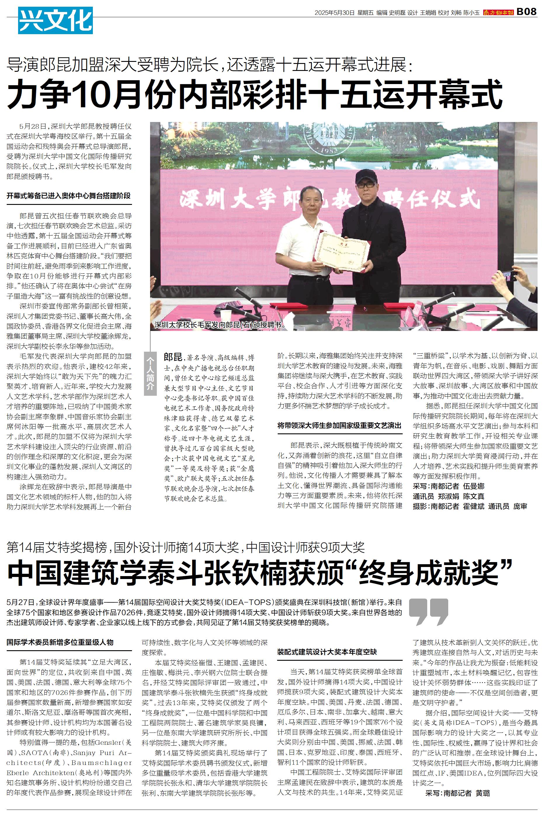 5月28日,深圳大学郎昆教授聘任仪式在深圳大学粤海校区举行。第十五届全国运动会和残特奥会开幕式总导演郎昆,受聘为深圳大学中国文化国际传播研究院院长。仪式上,深圳大学校长毛军发向郎昆颁授聘书。