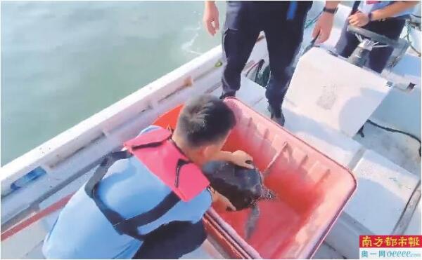 当日下午5时,深圳市深汕特别合作区海洋综合执法大队接渔民群众报称,在鲘门渔港内发现一只海龟,且根据现场渔民朋友判断,该海龟四肢游动缓慢,可能存在受伤情况。接报后,该大队立即派出执法人员前往现场处置。