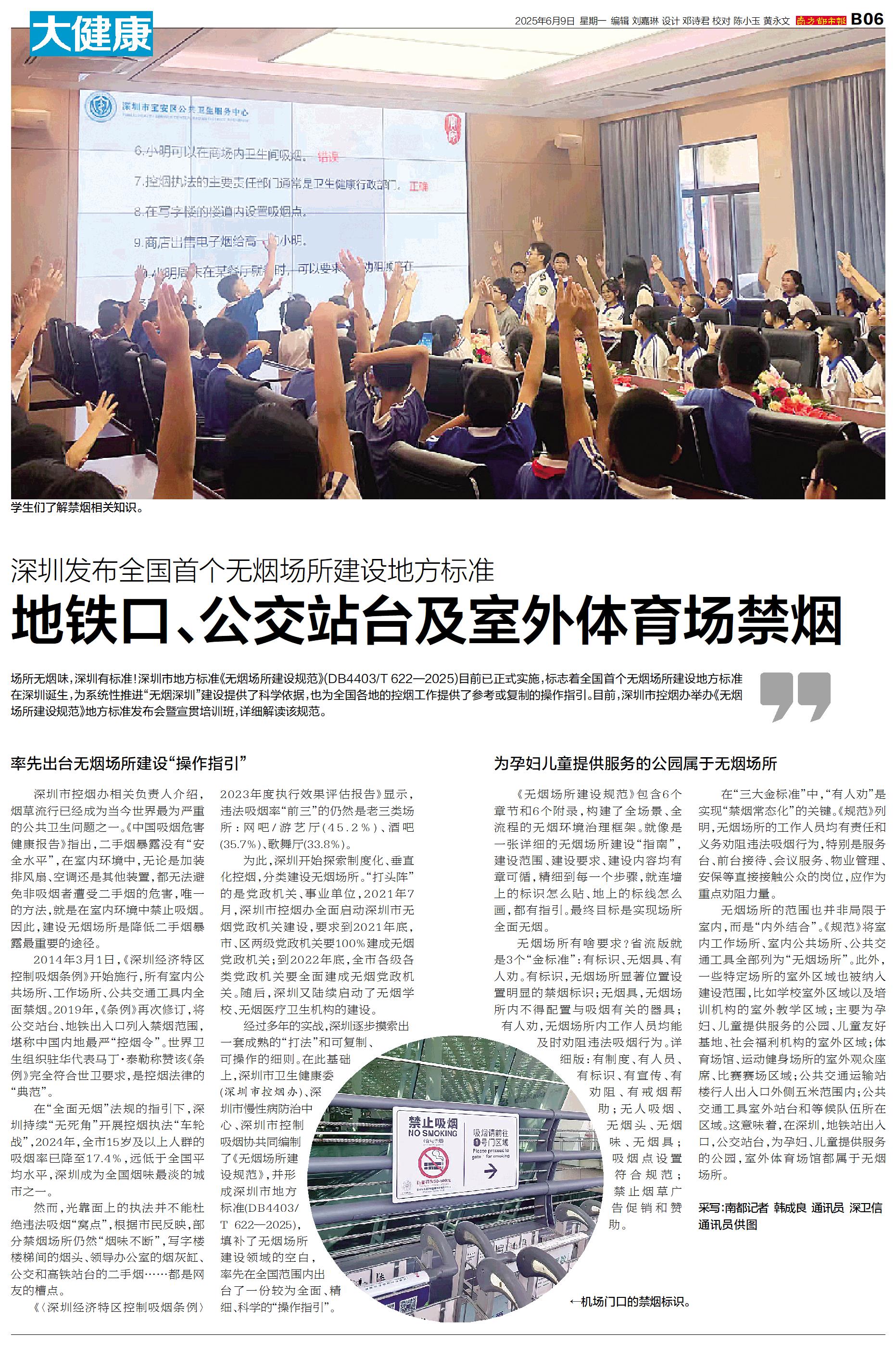 场所无烟味,深圳有标准!深圳市地方标准《无烟场所建设规范》(DB4403/T 622—2025)目前已正式实施,标志着全国首个无烟场所建设地方标准在深圳诞生,为系统性推进“无烟深圳”建设提供了科学