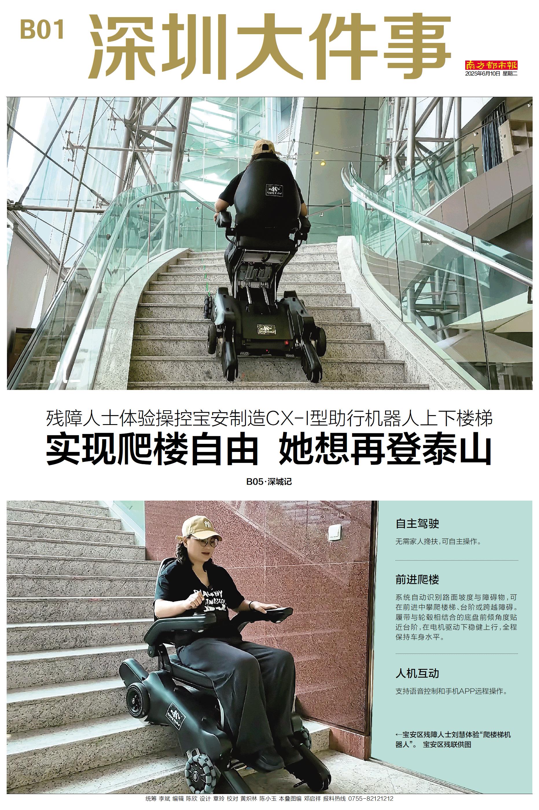 自主驾驶 无需家人搀扶,可自主操作。 前进爬楼 系统自动识别路面坡度与障碍物,可在前进中攀爬楼梯、台阶或跨越障碍。履带与轮毂相结合的底盘前倾角度贴近台阶,在电机驱动下稳健上行,全程保持车身水