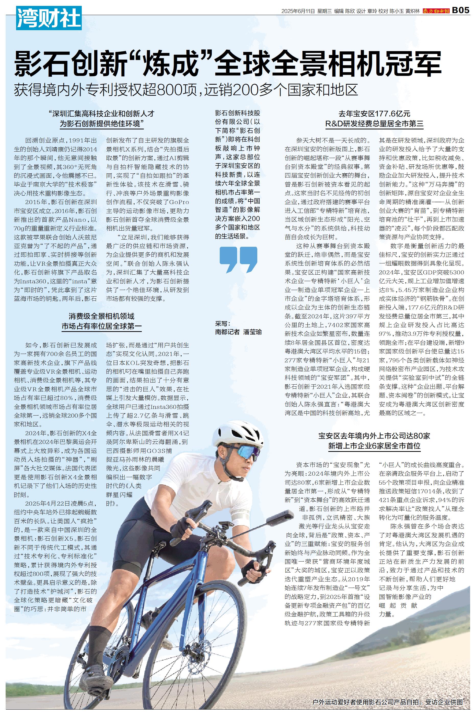 影石创新科技股份有限公司(以下简称“影石创新”)即将在科创板敲响上市钟声,这家总部位于深圳宝安区的科技新贵,以连续六年全球全景相机市占率第一的成绩,将“中国智造”的影像解决方案嵌入200多个国家和