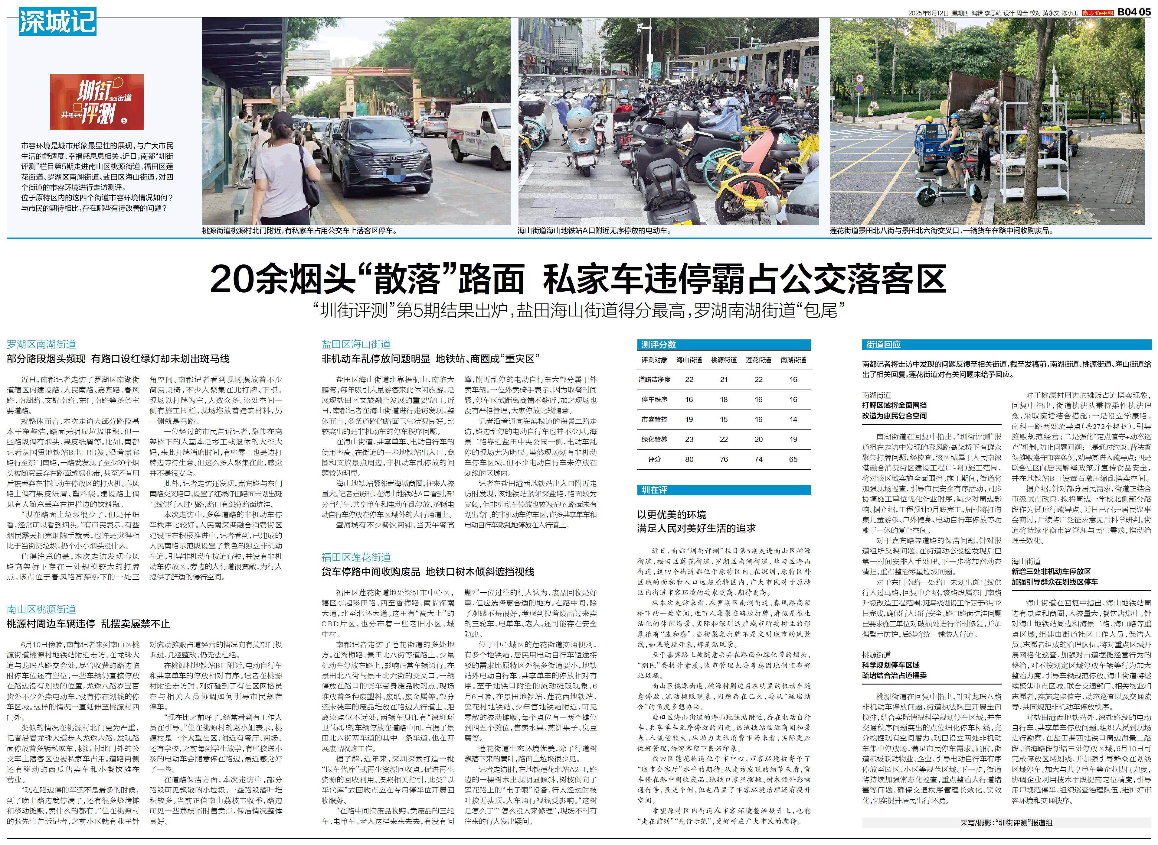 市容环境是城市形象最显性的展现,与广大市民生活的舒适度、幸福感息息相关。近日,南都“圳街评测”栏目第5期走进南山区桃源街道、福田区莲花街道、罗湖区南湖街道、盐田区海山街道,对四个街道的市容环境进行走访测评。