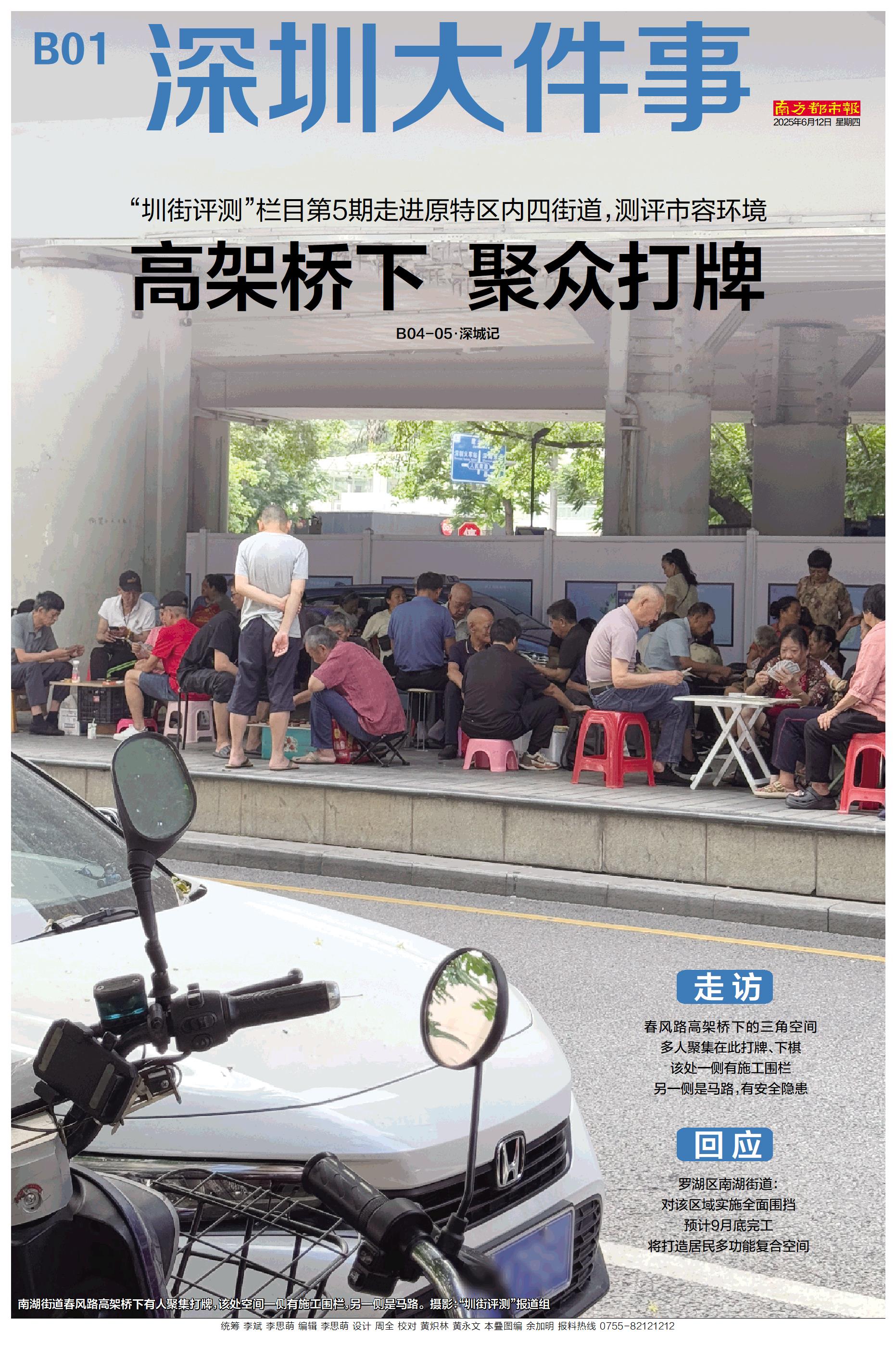 走 访 春风路高架桥下的三角空间多人聚集在此打牌、下棋 该处一侧有施工围栏 另一侧是马路,有安全隐患 回 应 罗湖区南湖街道: 对该区域实施全面围挡 预计9月底完工 将打造居民多功