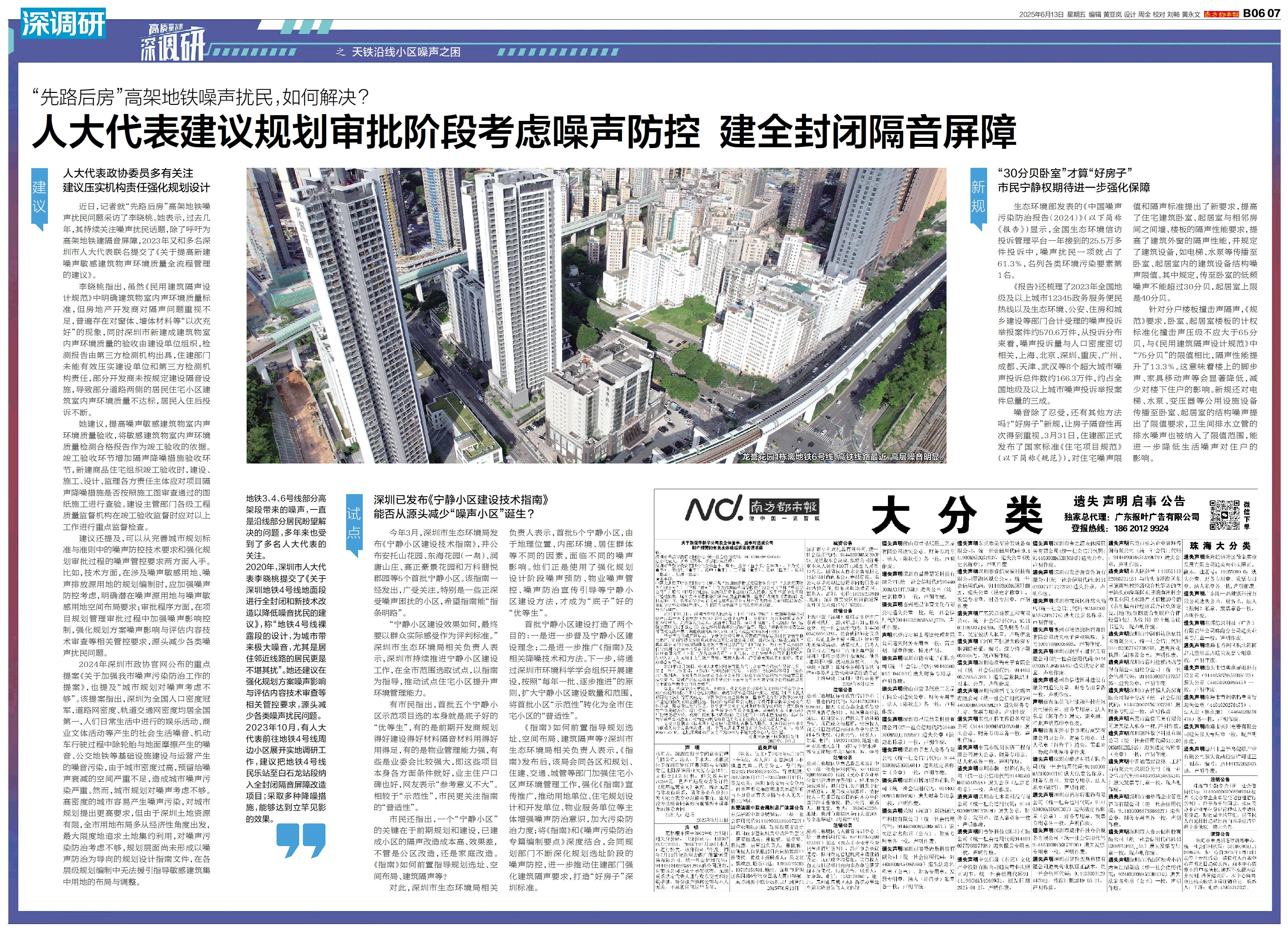 天铁沿线小区噪声之困 地铁3、4、6号线部分高架段带来的噪声,一直是沿线部分居民盼望解决的问题,多年来也受到了多名人大代表的关注。 2020年,深圳市人大代表李晓桃提交了《关于深圳地铁4号线地