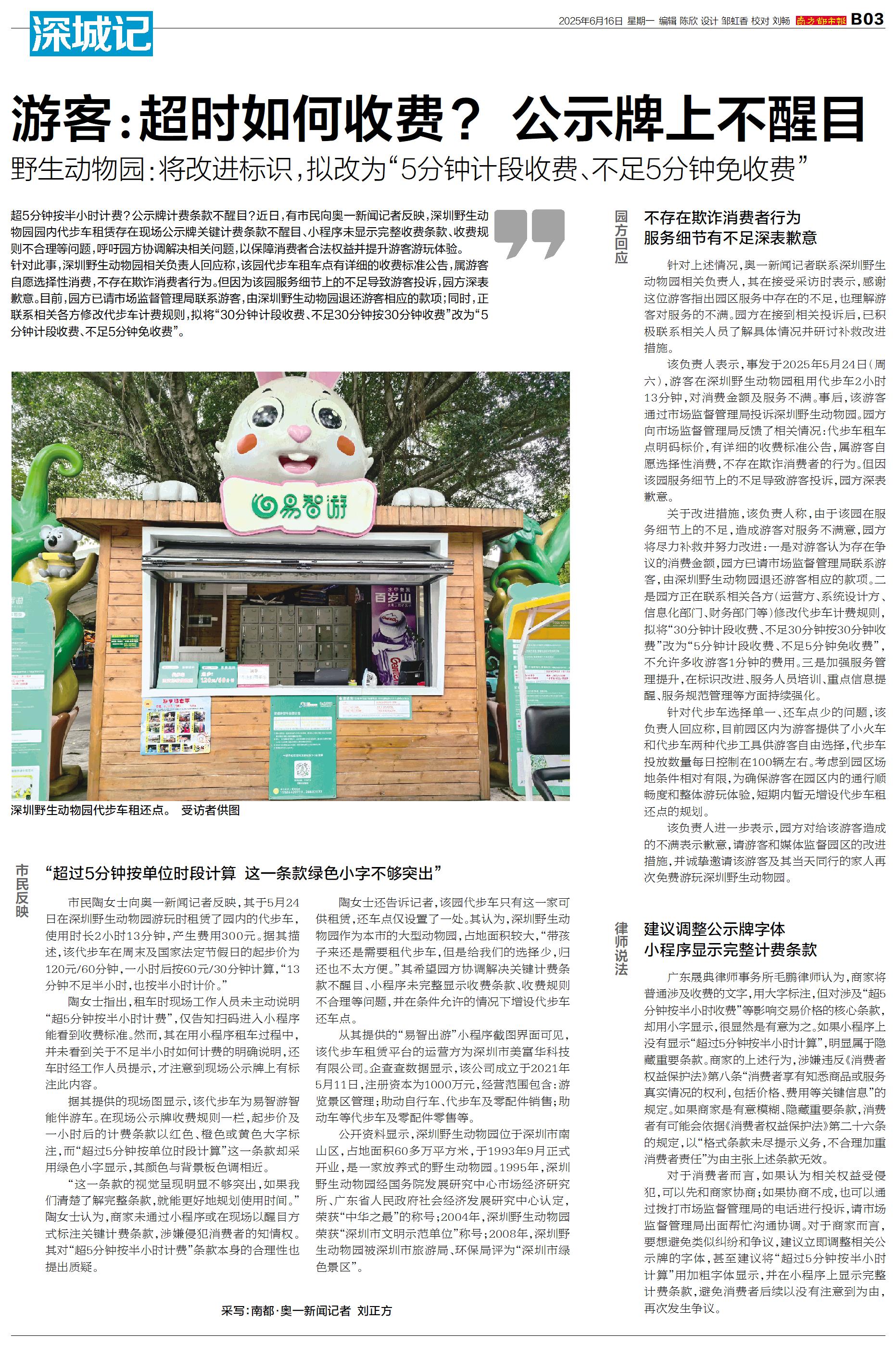 超5分钟按半小时计费?公示牌计费条款不醒目?近日,有市民向奥一新闻记者反映,深圳野生动物园园内代步车租赁存在现场公示牌关键计费条款不醒目、小程序未显示完整收费条款、收费规则不合理等问题,呼吁园方协
