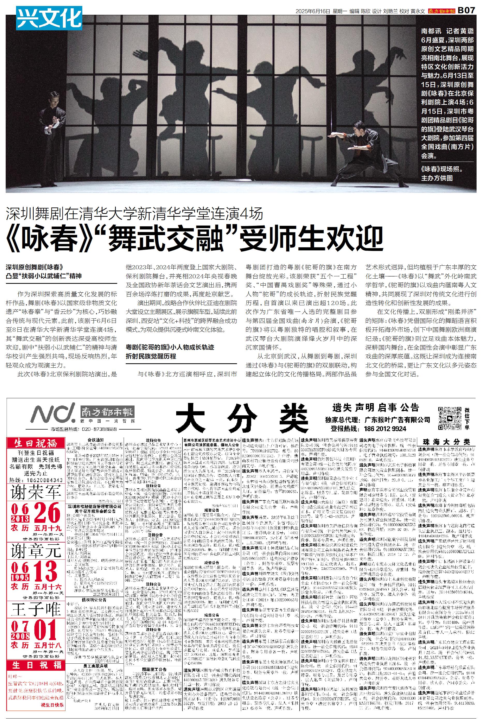南都讯 记者黄璐 6月盛夏,深圳两部原创文艺精品同期亮相南北舞台,展现特区文化创新活力与魅力。6月13日至15日,深圳原创舞剧《咏春》在北京保利剧院上演4场;6月15日,深圳市粤剧团精品剧目《驼哥