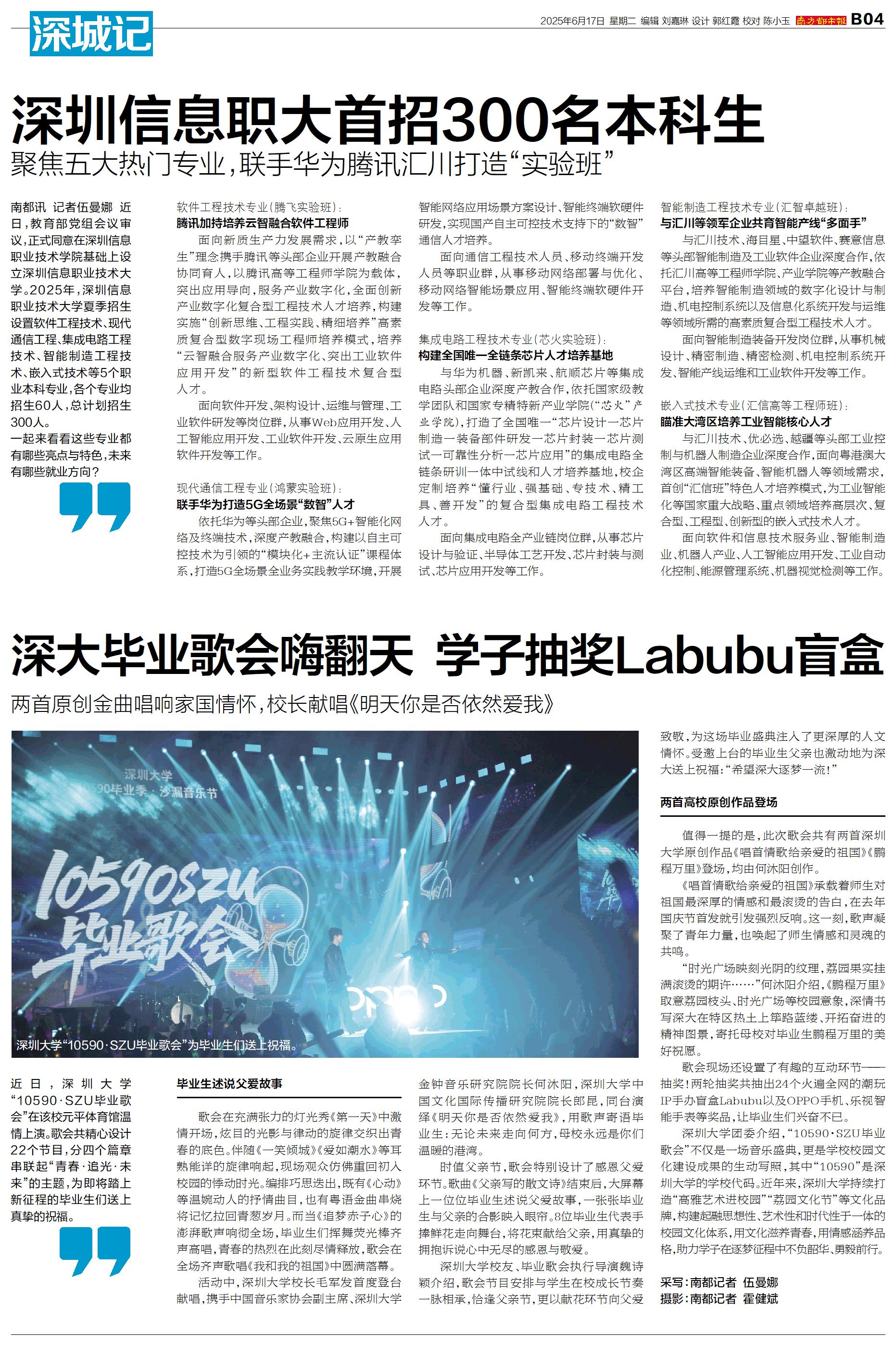 南都讯 记者伍曼娜 近日,教育部党组会议审议,正式同意在深圳信息职业技术学院基础上设立深圳信息职业技术大学。2025年,深圳信息职业技术大学夏季招生设置软件工程技术、现代通信工程、集成电路工程技术