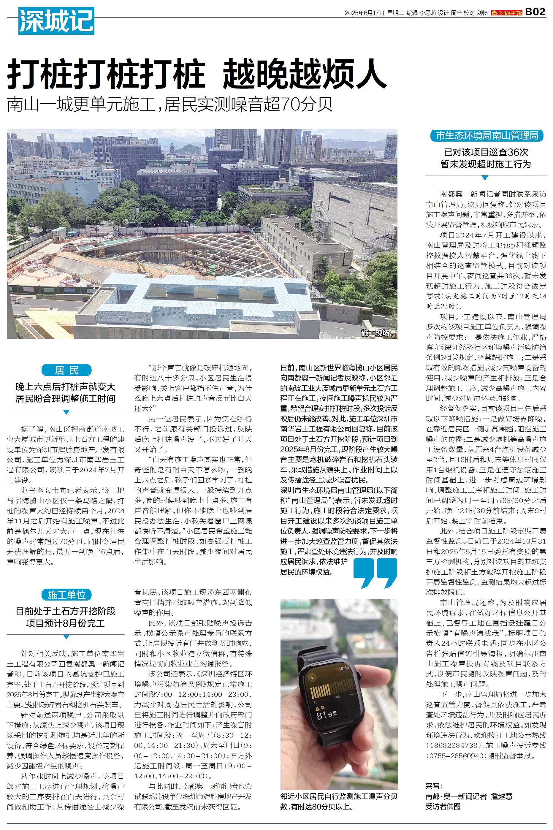 日前,南山区新世界临海揽山小区居民向南都奥一新闻记者反映称,小区邻近的南玻工业大厦城市更新单元土石方工程正在施工,夜间施工噪声扰民较为严重,希望合理安排打桩时段,多次投诉反映后仍未能改善。对此,施