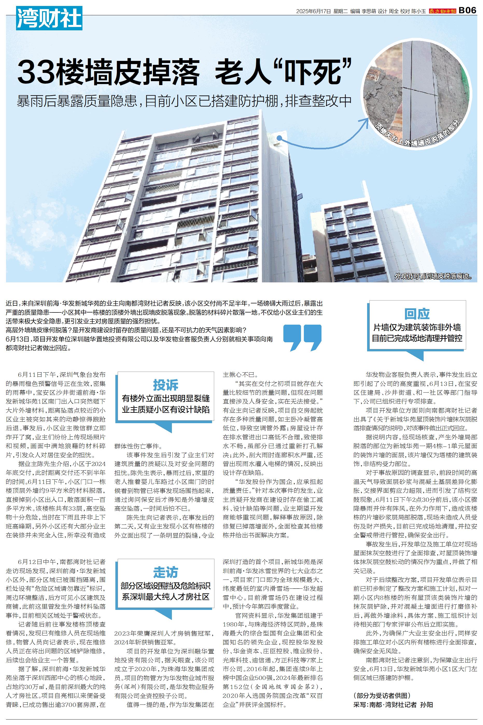 近日,来自深圳前海·华发新城华苑的业主向南都湾财社记者反映,该小区交付尚不足半年,一场磅礴大雨过后,暴露出严重的质量隐患——小区其中一栋楼的顶楼外墙出现墙皮脱落现象。脱落的材料碎片散落一地,不仅给