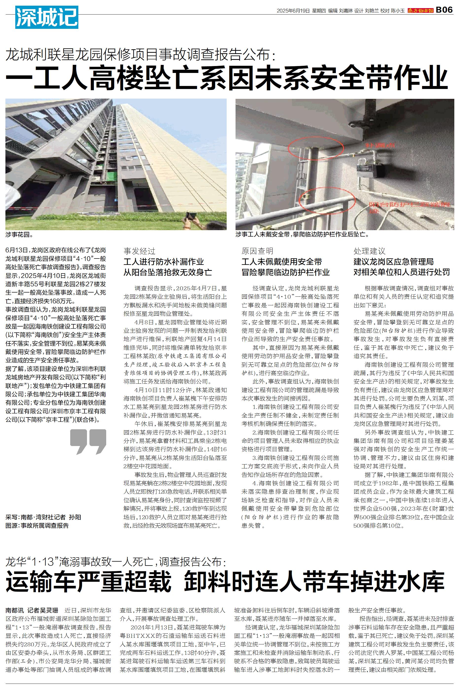 6月13日,龙岗区政府在线公布了《龙岗龙城利联星龙园保修项目“4·10”一般高处坠落死亡事故调查报告》。调查报告显示,2025年4月10日,龙岗区龙城街道新丰路55号利联星龙园2栋27楼发生一起一