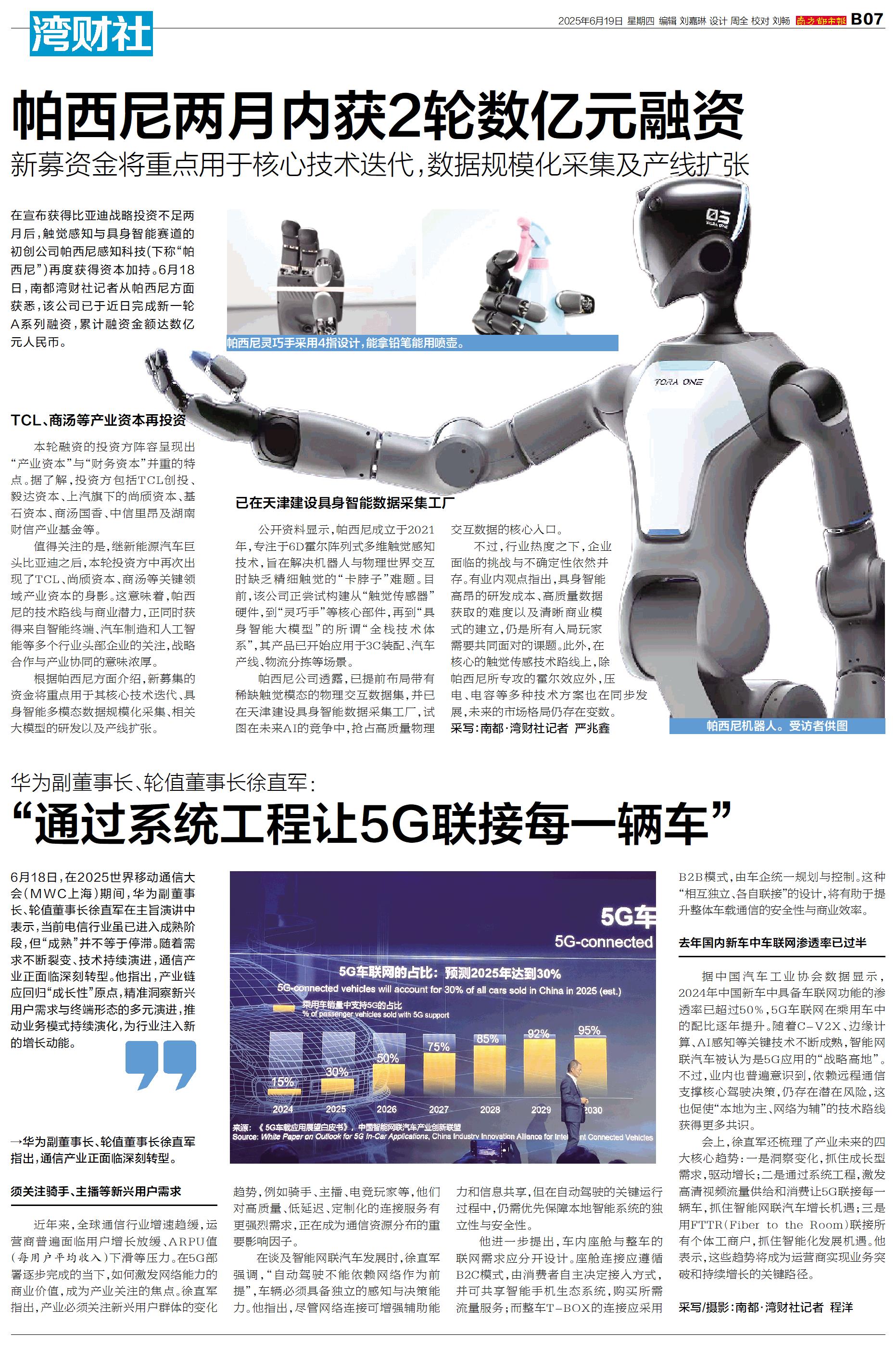 在宣布获得比亚迪战略投资不足两月后,触觉感知与具身智能赛道的初创公司帕西尼感知科技(下称“帕西尼”)再度获得资本加持。6月18日,南都湾财社记者从帕西尼方面获悉,该公司已于近日完成新一轮A系列融资