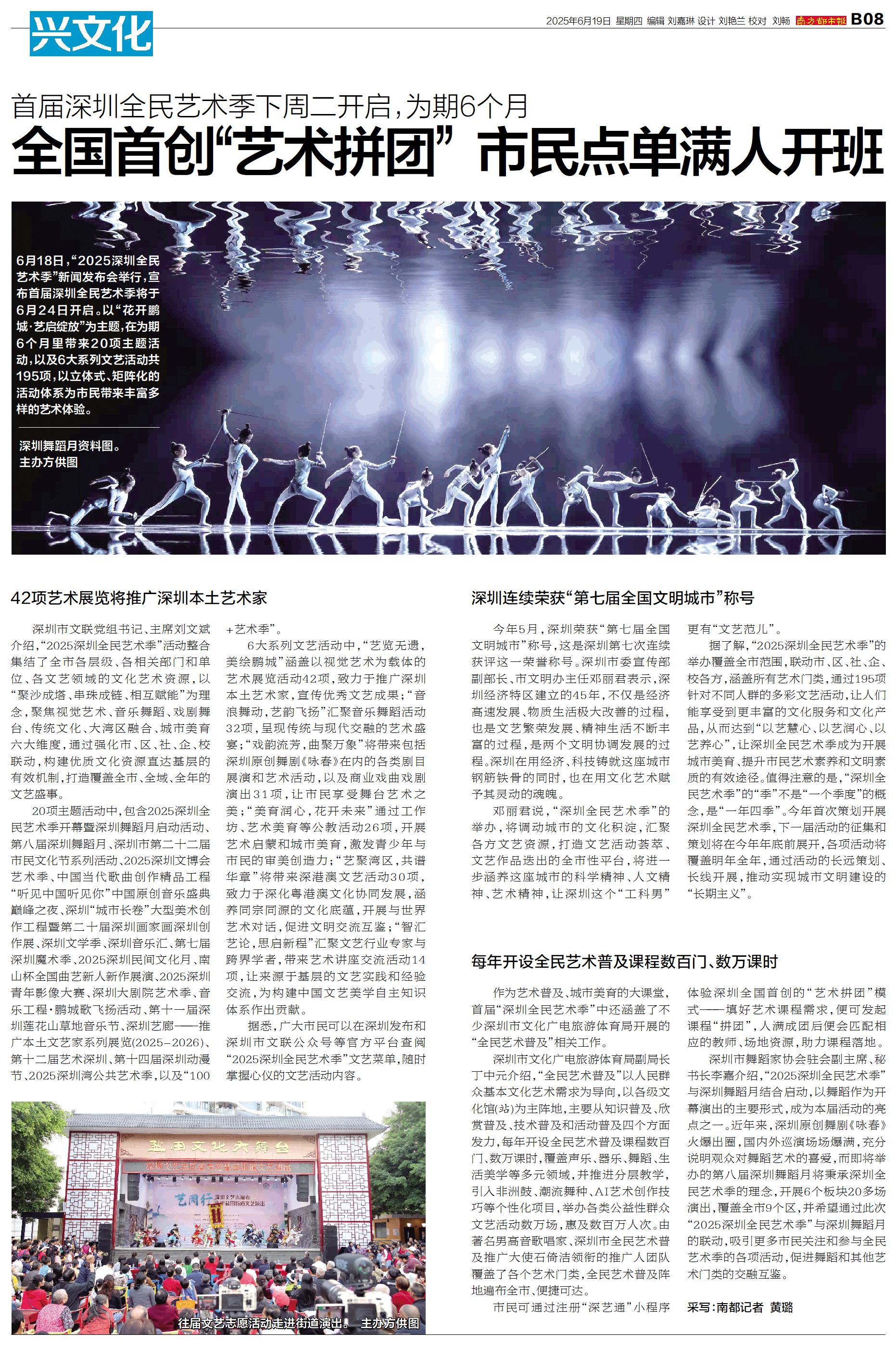 6月18日,“2025深圳全民艺术季”新闻发布会举行,宣布首届深圳全民艺术季将于6月24日开启。以“花开鹏城·艺启绽放”为主题,在为期6个月里带来20项主题活动,以及6大系列文艺活动共195项,以