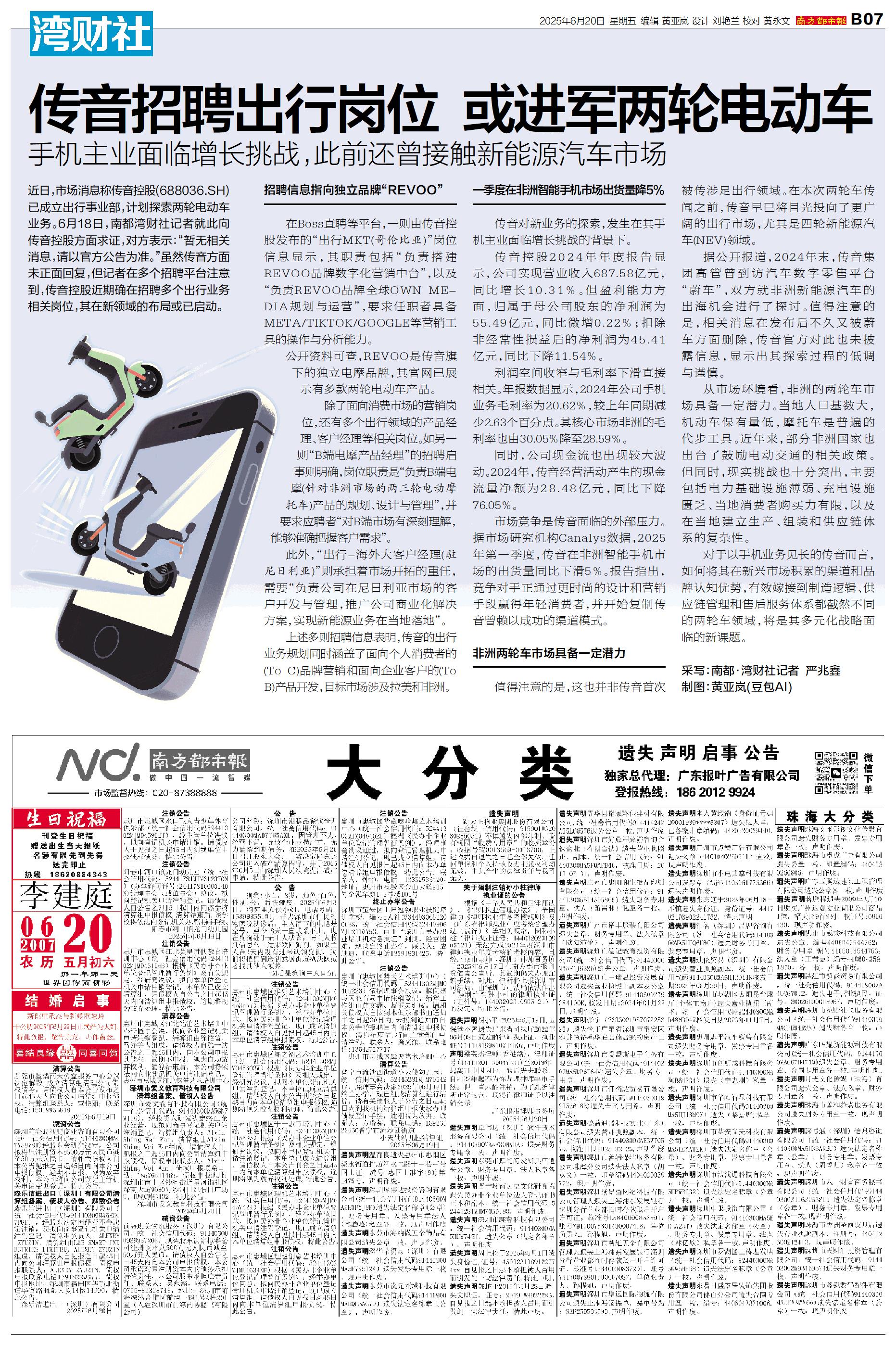 近日,市场消息称传音控股(688036.SH)已成立出行事业部,计划探索两轮电动车业务。6月18日,南都湾财社记者就此向传音控股方面求证,对方表示:“暂无相关消息,请以官方公告为准。”虽然传音方面