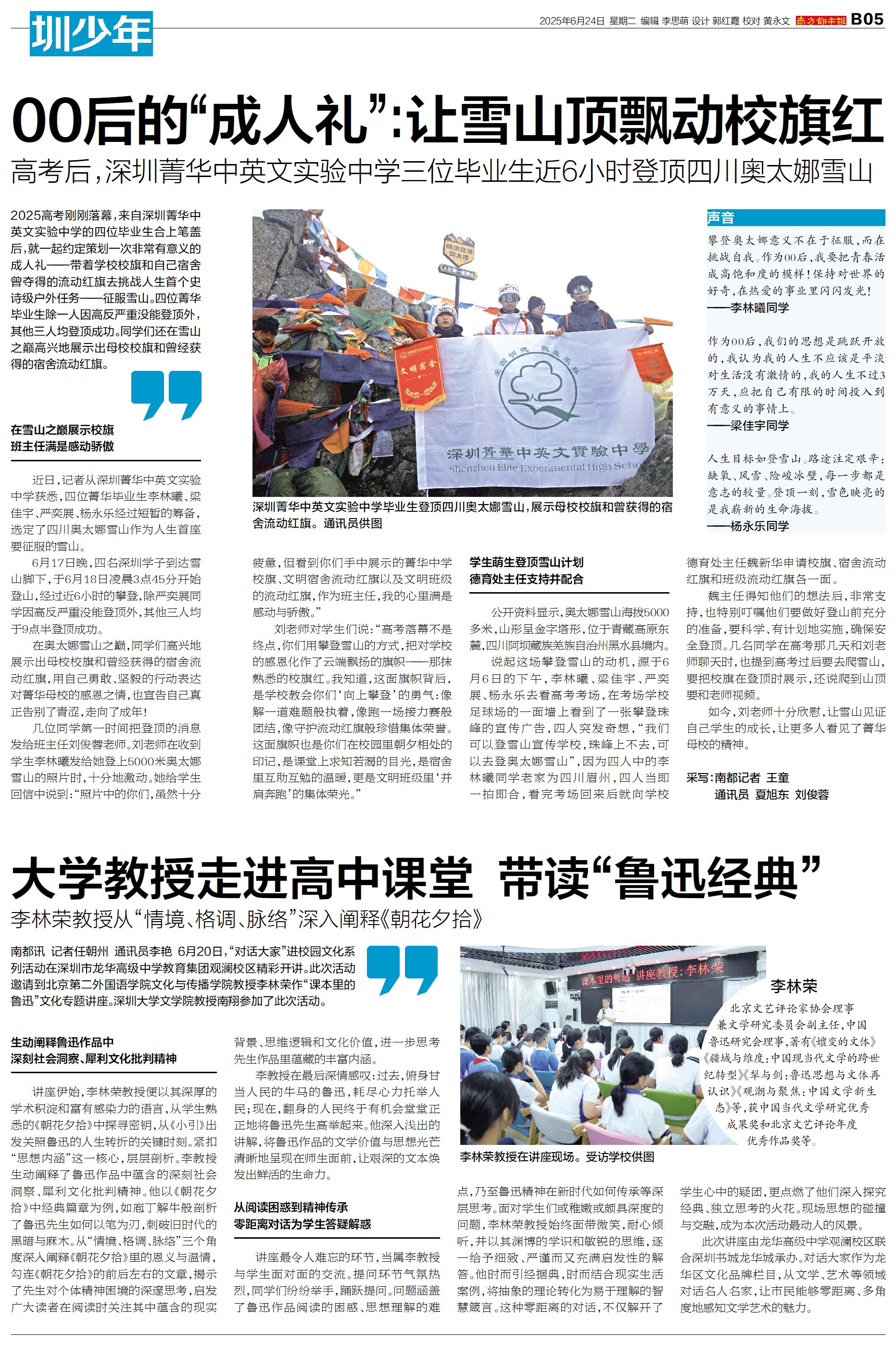2025高考刚刚落幕,来自深圳菁华中英文实验中学的四位毕业生合上笔盖后,就一起约定策划一次非常有意义的成人礼——带着学校校旗和自己宿舍曾夺得的流动红旗去挑战人生首个史诗级户外任务——征服雪山。四位