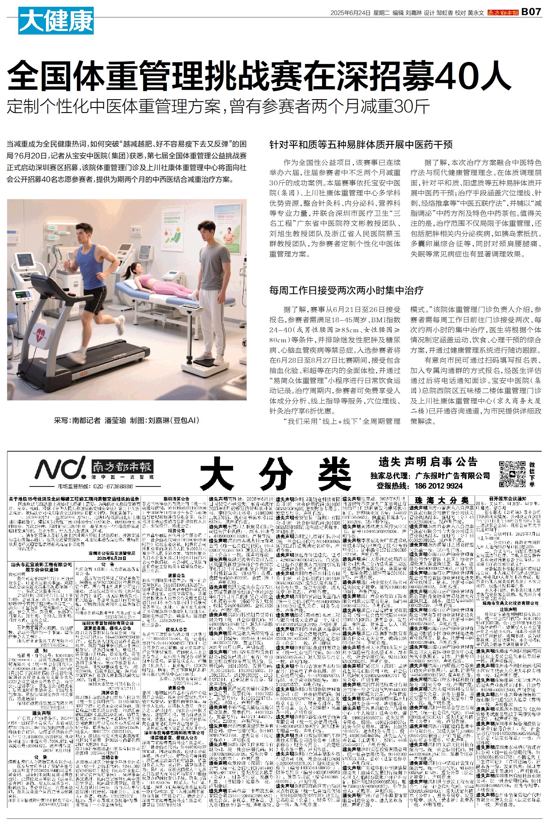当减重成为全民健康热词,如何突破“越减越肥、好不容易瘦下去又反弹”的困局?6月20日,记者从宝安中医院(集团)获悉,第七届全国体重管理公益挑战赛正式启动深圳赛区招募,该院体重管理门诊及上川社康体重