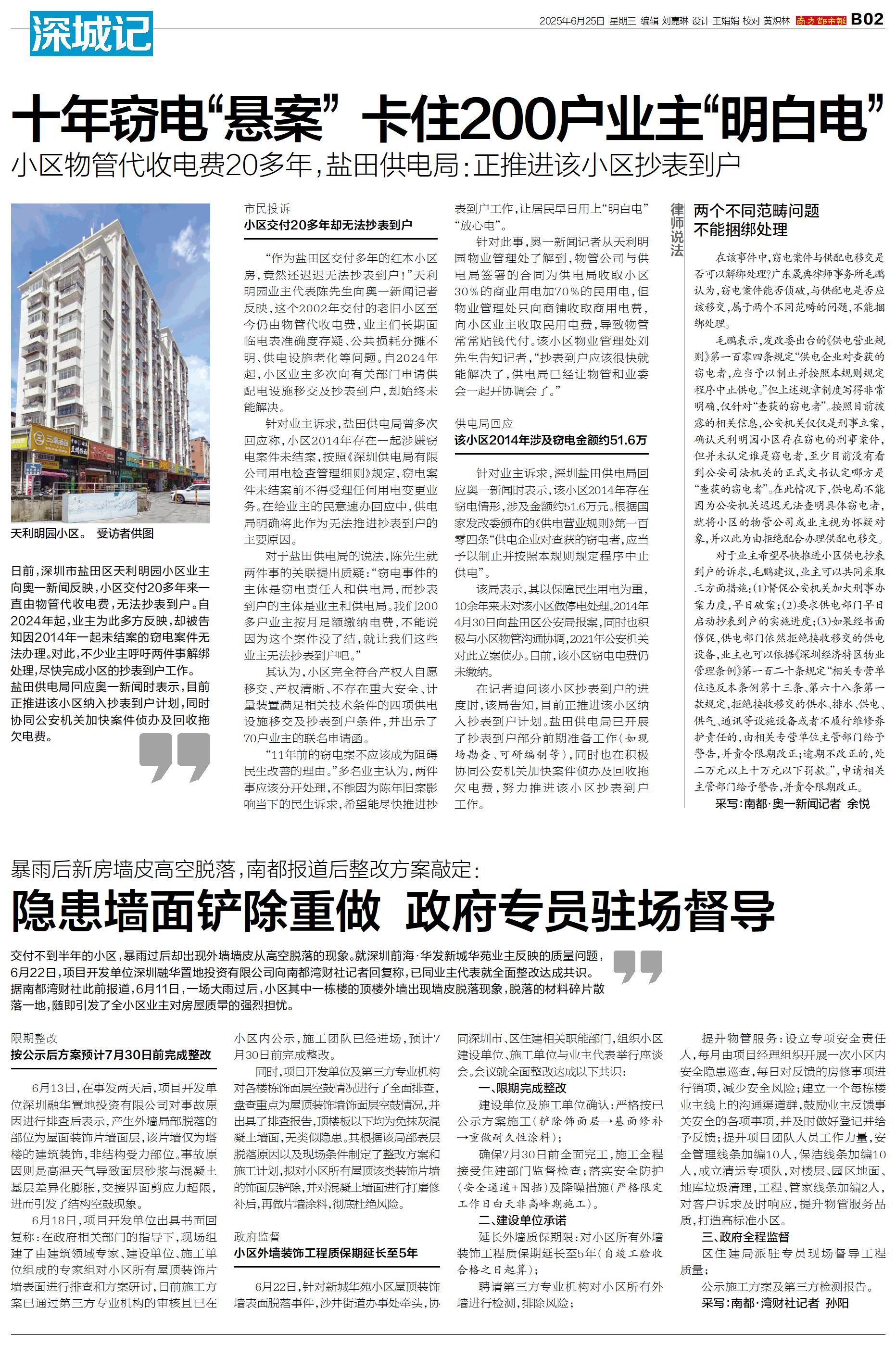 交付不到半年的小区,暴雨过后却出现外墙墙皮从高空脱落的现象。就深圳前海·华发新城华苑业主反映的质量问题,6月22日,项目开发单位深圳融华置地投资有限公司向南都湾财社记者回复称,已同业主代表就全面整