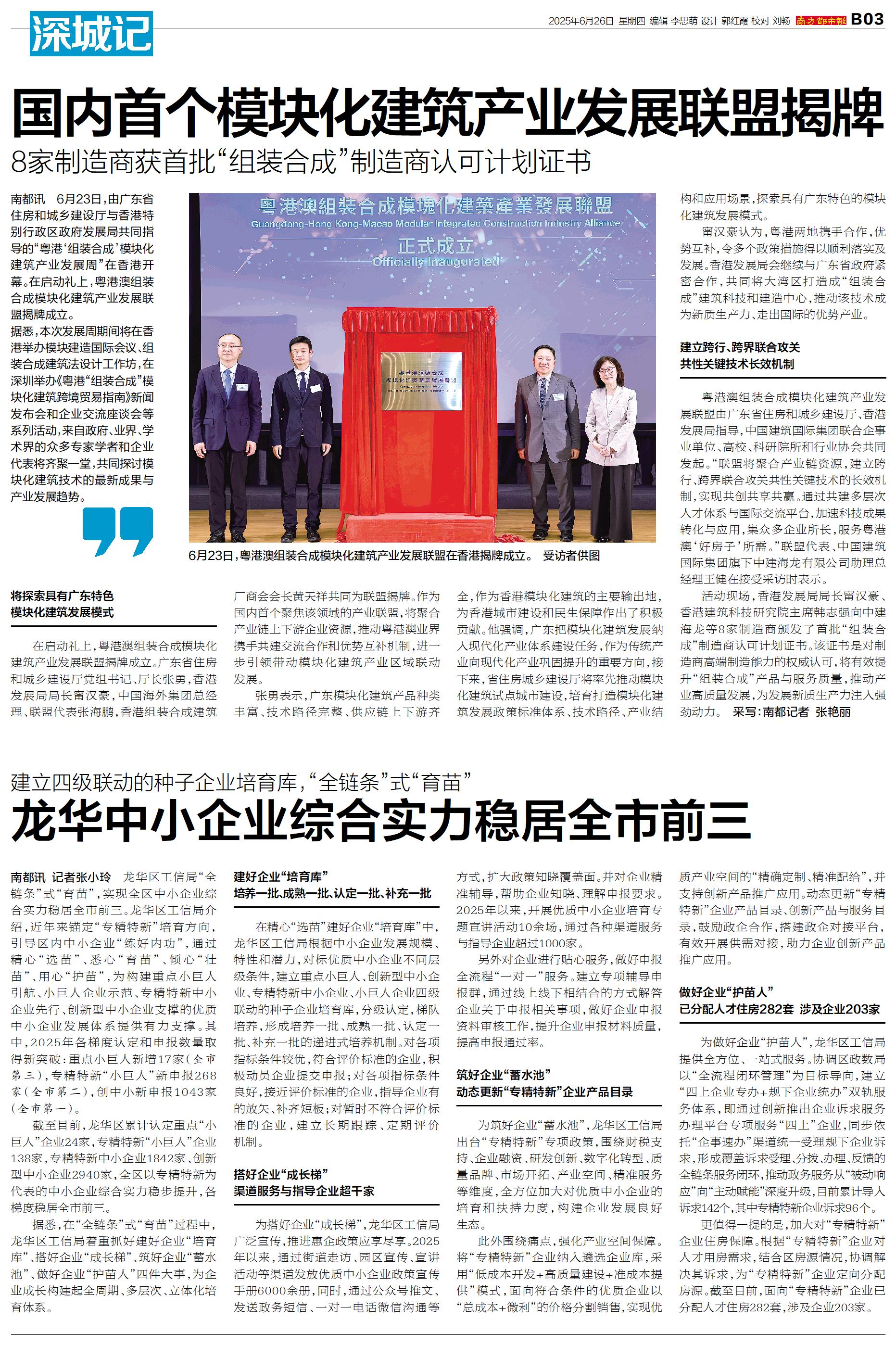 南都讯 6月23日,由广东省住房和城乡建设厅与香港特别行政区政府发展局共同指导的“粤港‘组装合成’模块化建筑产业发展周”在香港开幕。在启动礼上,粤港澳组装合成模块化建筑产业发展联盟揭牌成立。 据