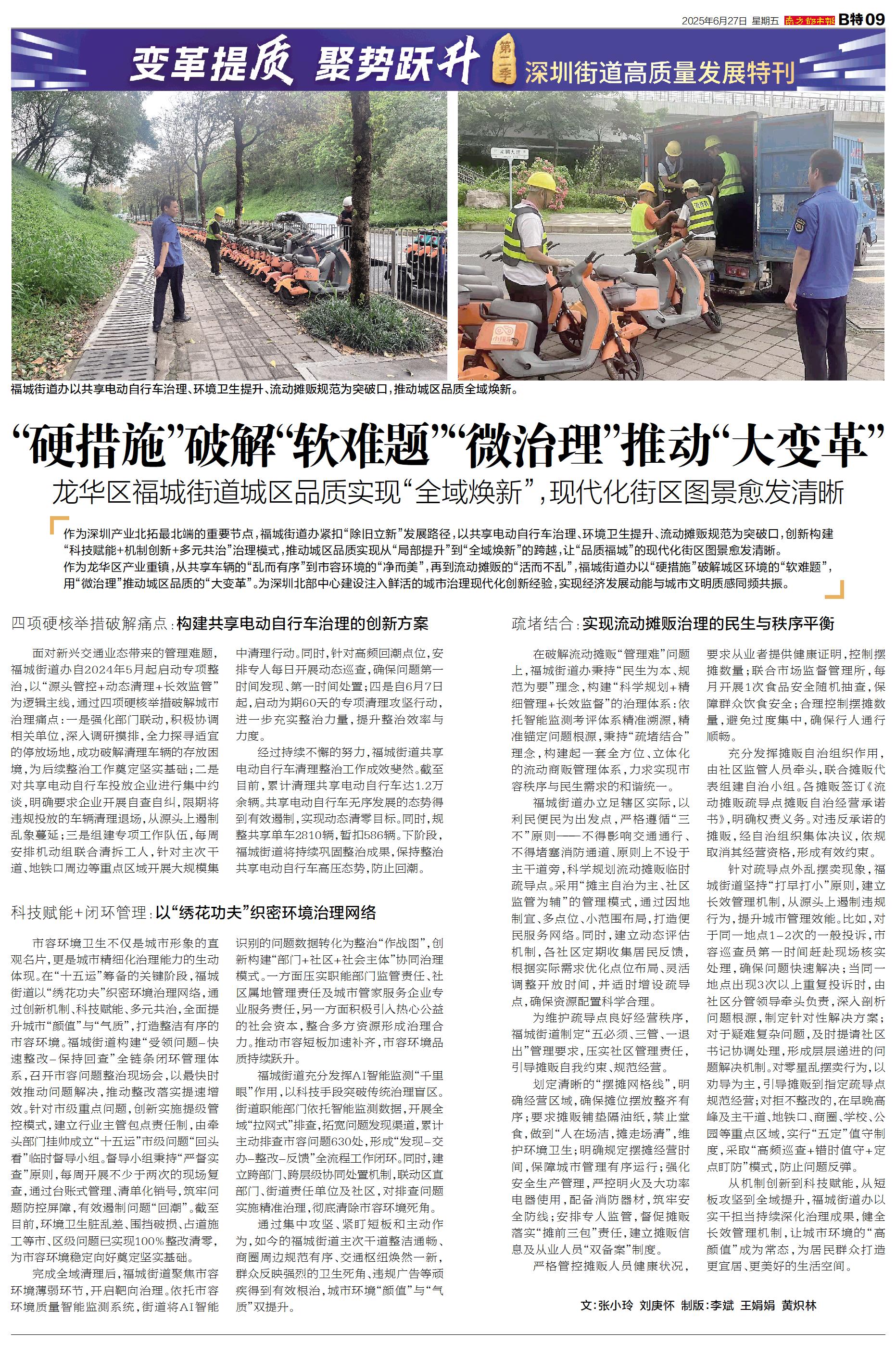 作为深圳产业北拓最北端的重要节点,福城街道办紧扣“除旧立新”发展路径,以共享电动自行车治理、环境卫生提升、流动摊贩规范为突破口,创新构建“科技赋能+机制创新+多元共治”治理模式,推动城区品质实现从