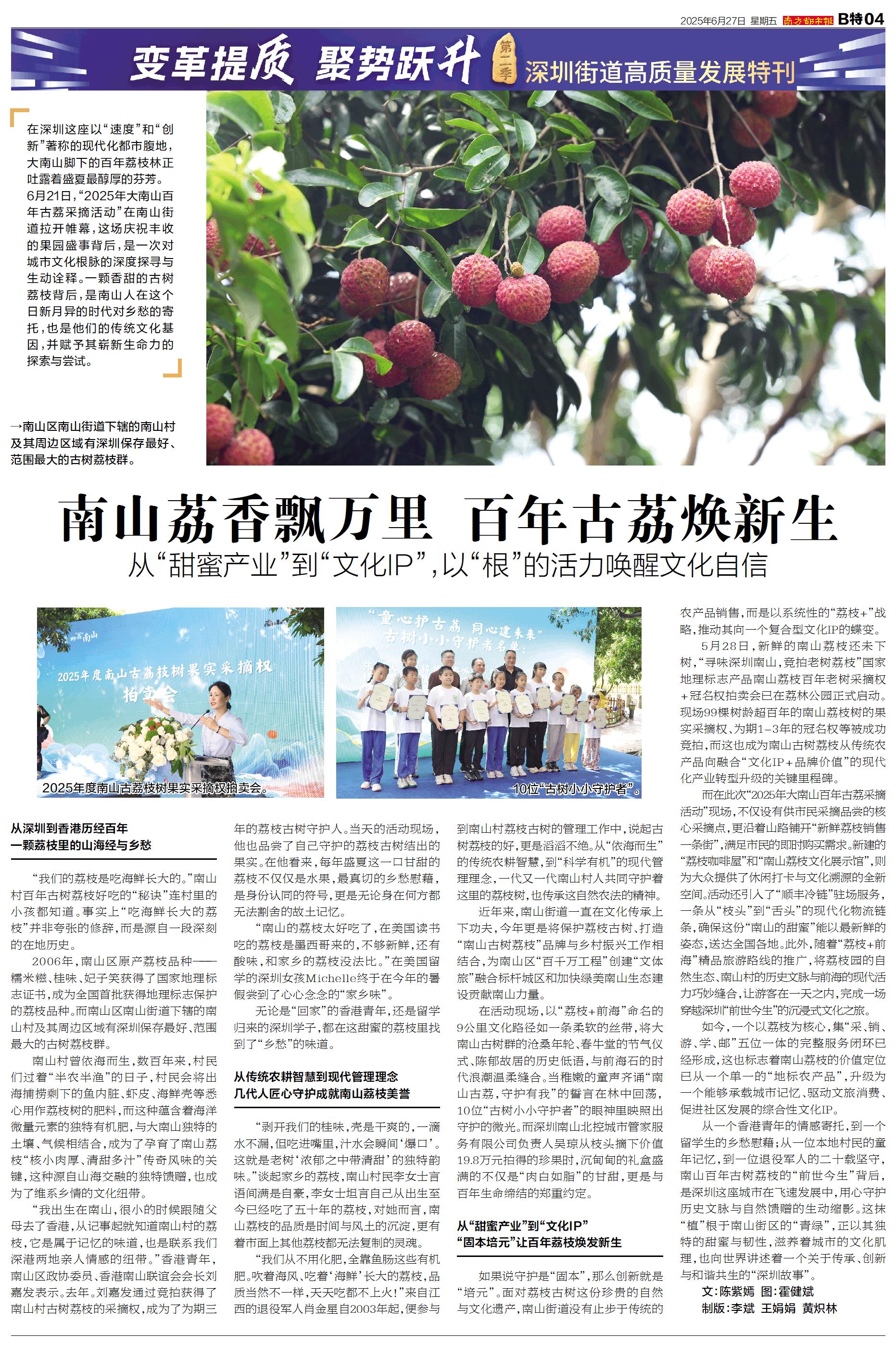 在深圳这座以“速度”和“创新”著称的现代化都市腹地,大南山脚下的百年荔枝林正吐露着盛夏最醇厚的芬芳。 6月21日,“2025年大南山百年古荔采摘活动”在南山街道拉开帷幕,这场庆祝丰收的果园盛事背