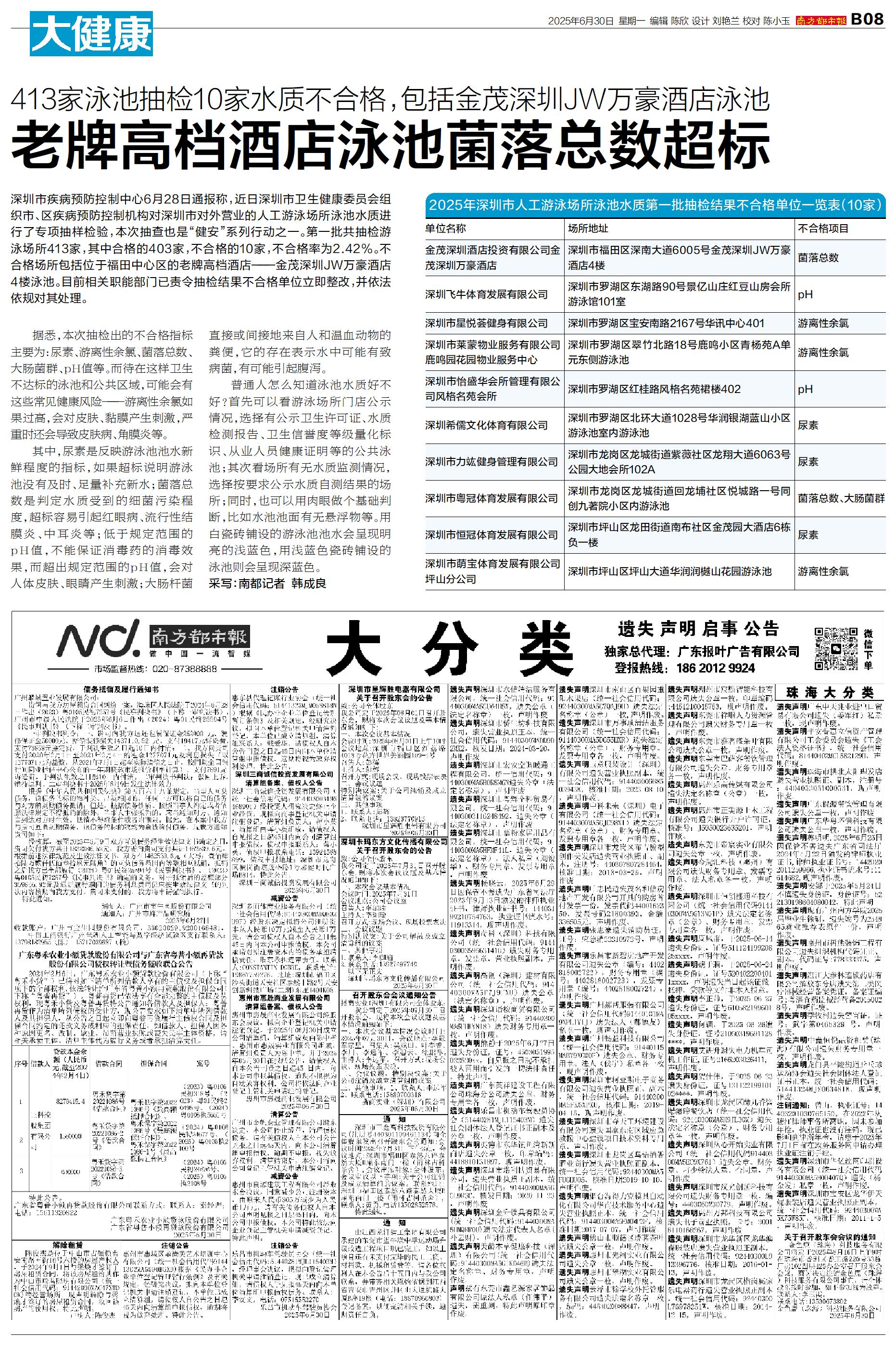 深圳市疾病预防控制中心6月28日通报称,近日深圳市卫生健康委员会组织市、区疾病预防控制机构对深圳市对外营业的人工游泳场所泳池水质进行了专项抽样检验,本次抽查也是“健安”系列行动之一。第一批共抽检游