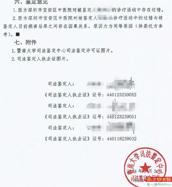 综合考虑现代医学科学的局限性、疾病隐匿性及医疗机构等级等因素,鉴定中心最终给出鉴定意见为:宝安区中医院对杨女士的诊疗活动存在过错,该过错与患者目前损害后果之间存在因果关系,原因力为同等原因。