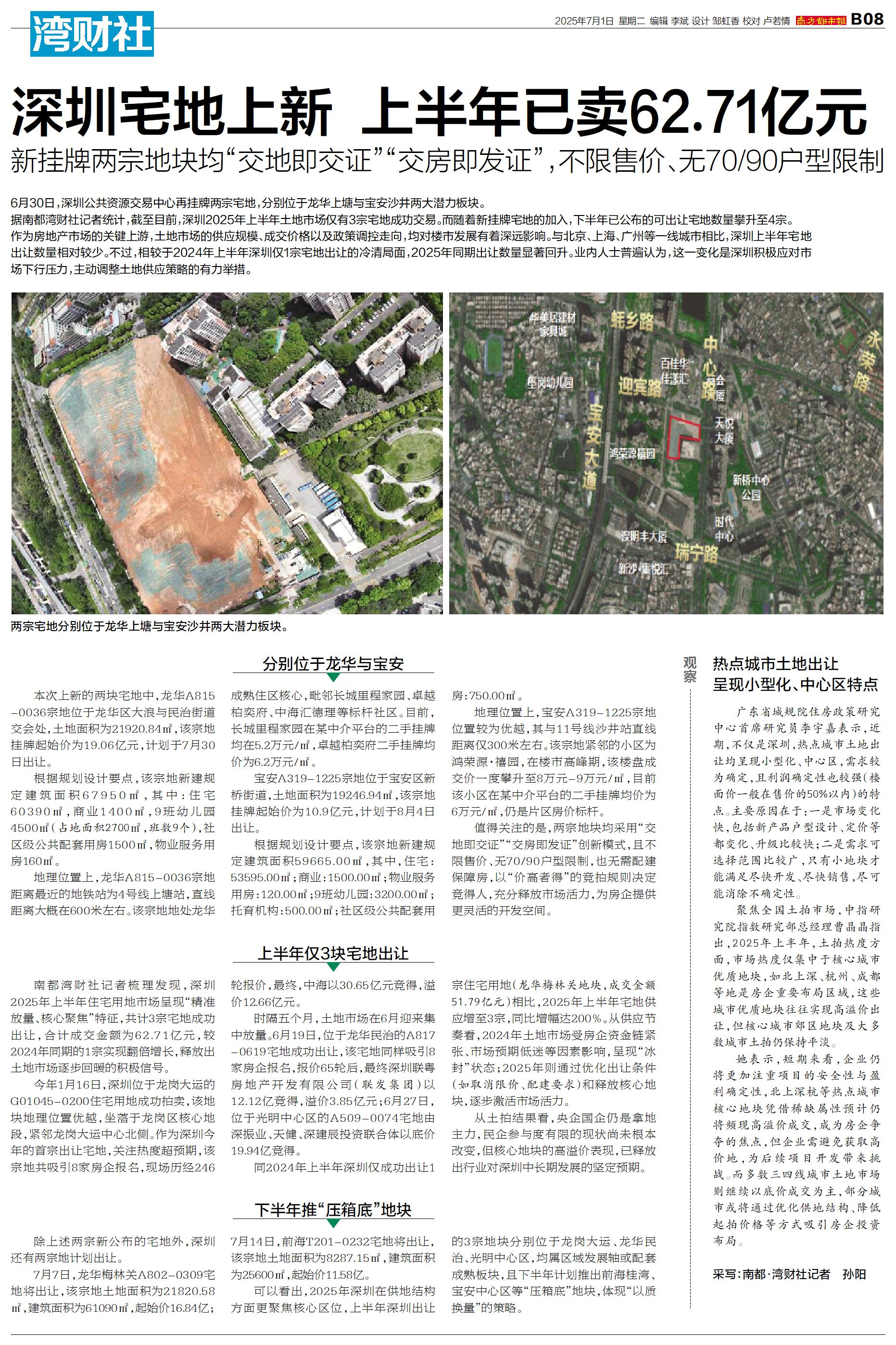 6月30日,深圳公共资源交易中心再挂牌两宗宅地,分别位于龙华上塘与宝安沙井两大潜力板块。 据南都湾财社记者统计,截至目前,深圳2025年上半年土地市场仅有3宗宅地成功交易。而随着新挂牌宅地的加入