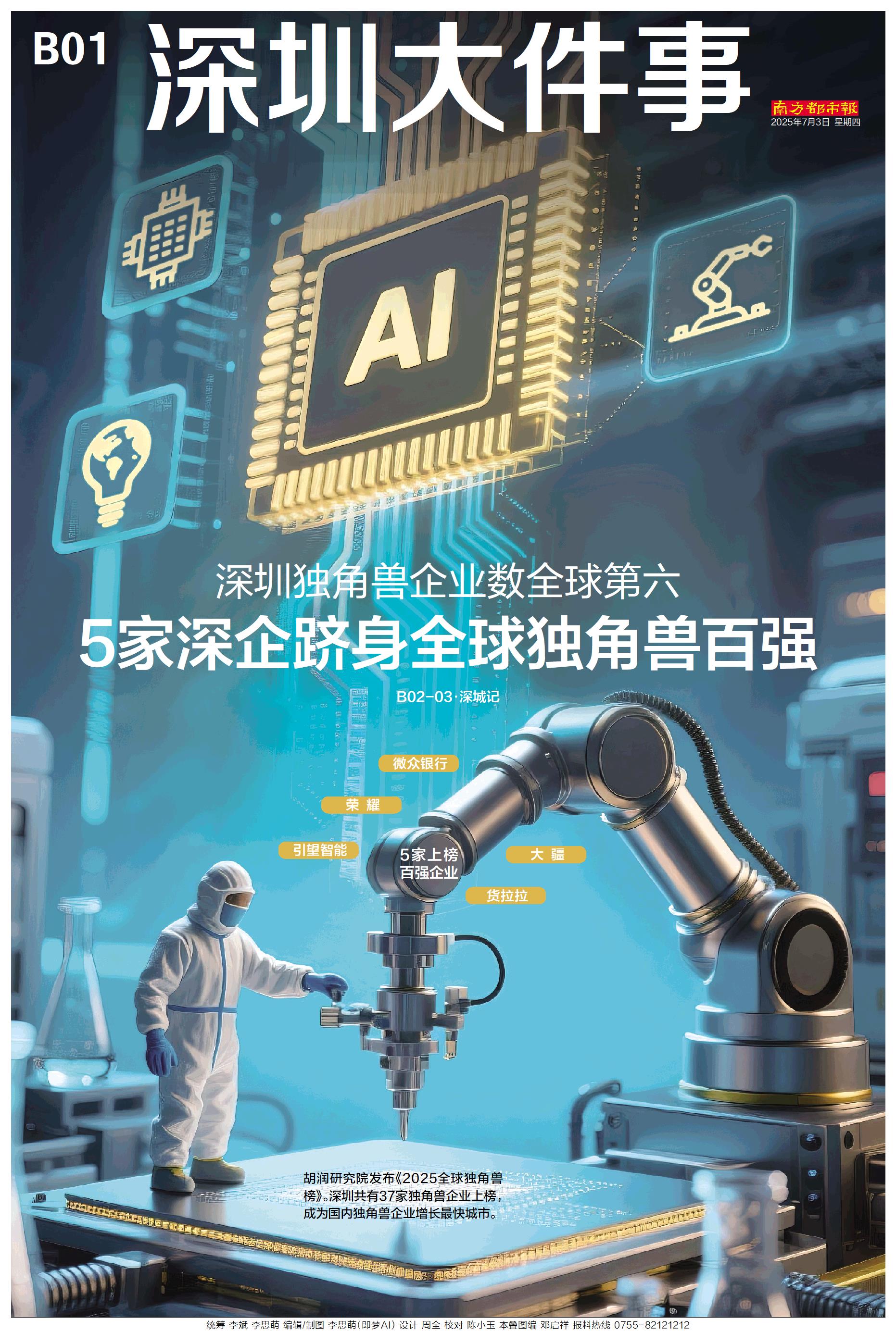 胡润研究院发布《2025全球独角兽榜》。深圳共有37家独角兽企业上榜,成为国内独角兽企业增长最快城市。 5家上榜百强企业 微众银行 荣耀 引望智能 大疆 货拉拉 B02-03·深城记