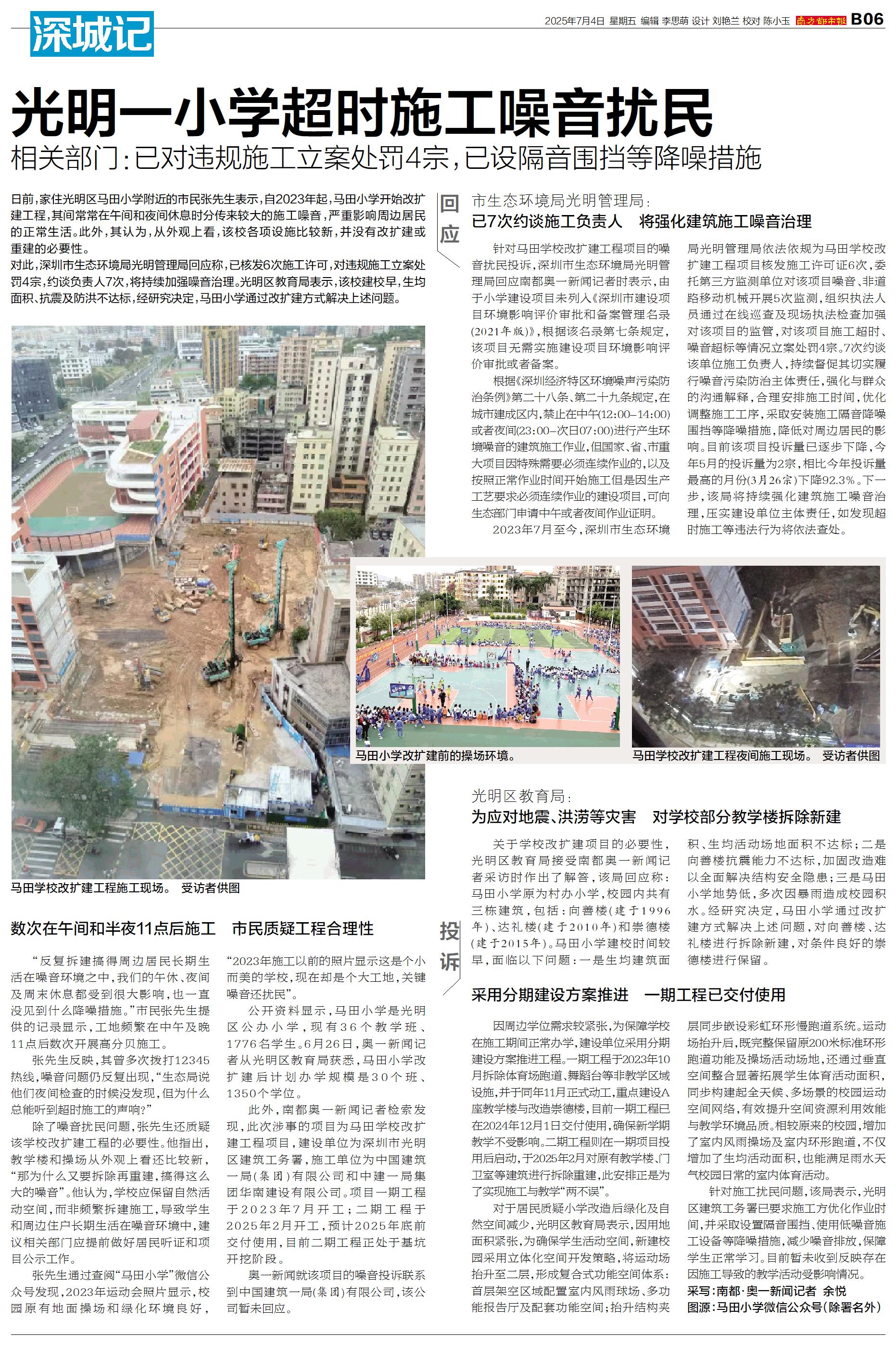 日前,家住光明区马田小学附近的市民张先生表示,自2023年起,马田小学开始改扩建工程,其间常常在午间和夜间休息时分传来较大的施工噪音,严重影响周边居民的正常生活。此外,其认为,从外观上看,该校各项