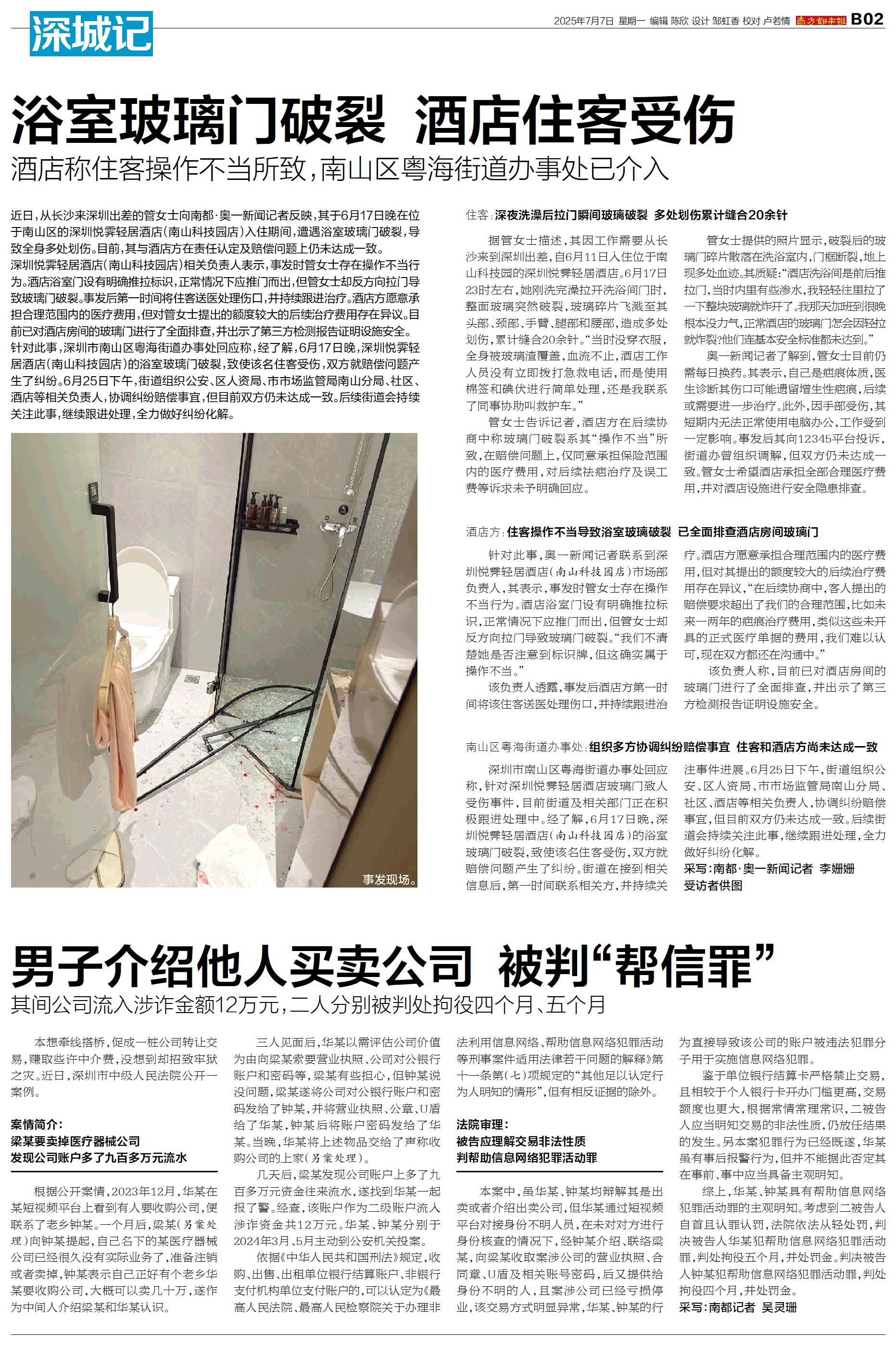 近日,从长沙来深圳出差的管女士向南都·奥一新闻记者反映,其于6月17日晚在位于南山区的深圳悦霁轻居酒店(南山科技园店)入住期间,遭遇浴室玻璃门破裂,导致全身多处划伤。目前,其与酒店方在责任认定及赔