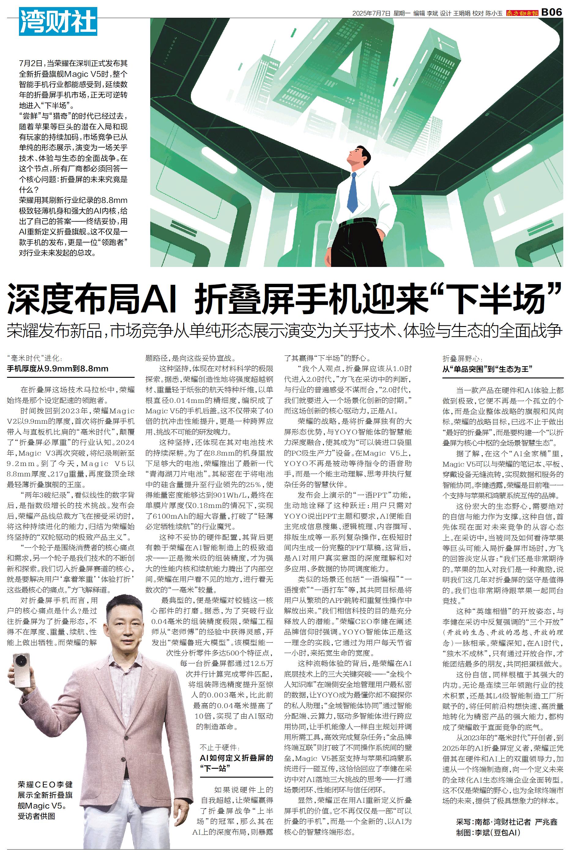 7月2日,当荣耀在深圳正式发布其全新折叠旗舰Magic V5时,整个智能手机行业都能感受到,延续数年的折叠屏手机市场,正无可逆转地进入“下半场”。 “尝鲜”与“猎奇”的时代已经过去,随着苹果等巨