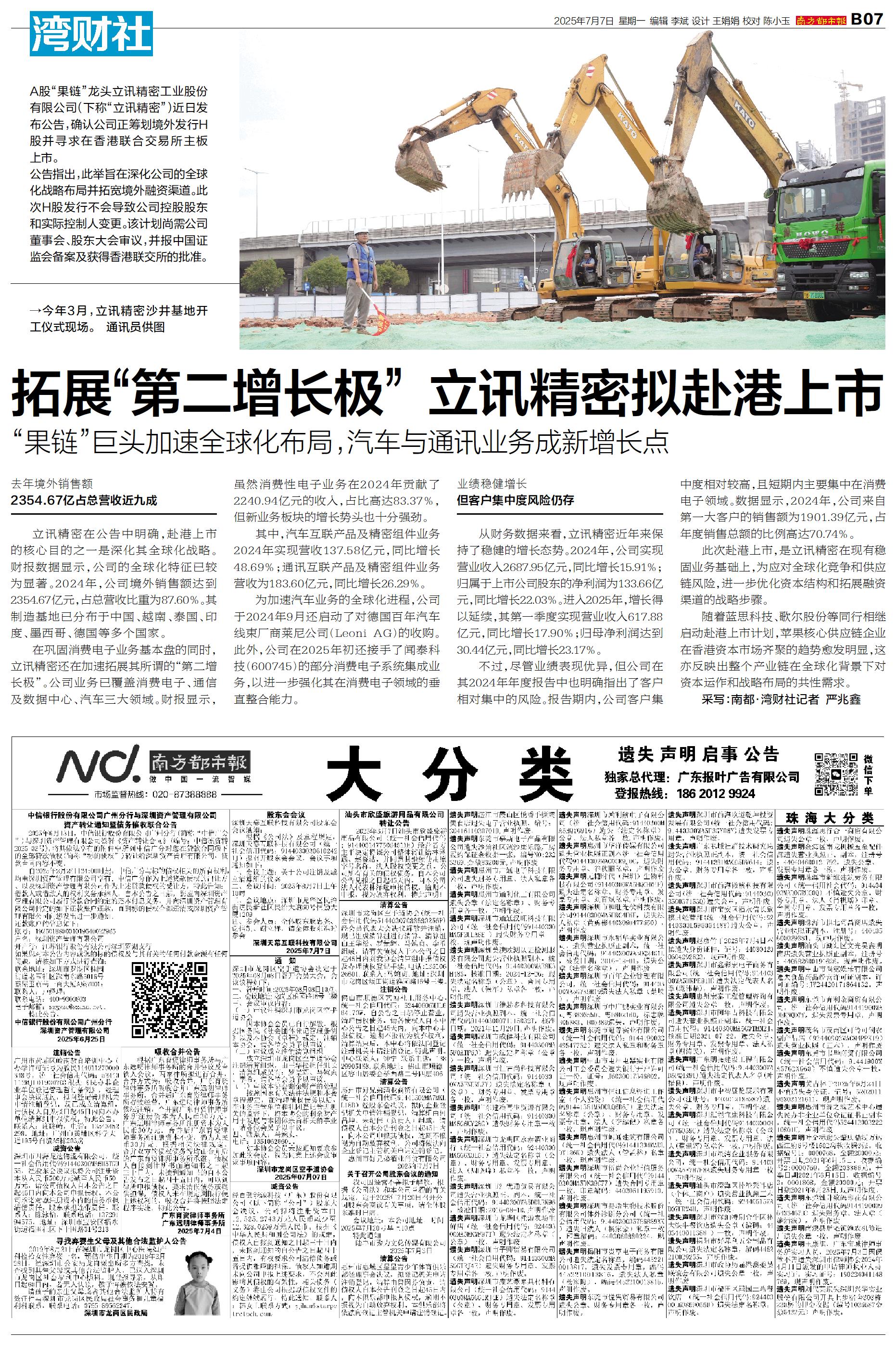 A股“果链”龙头立讯精密工业股份有限公司(下称“立讯精密”)近日发布公告,确认公司正筹划境外发行H股并寻求在香港联合交易所主板上市。 公告指出,此举旨在深化公司的全球化战略布局并拓宽境外融资渠道