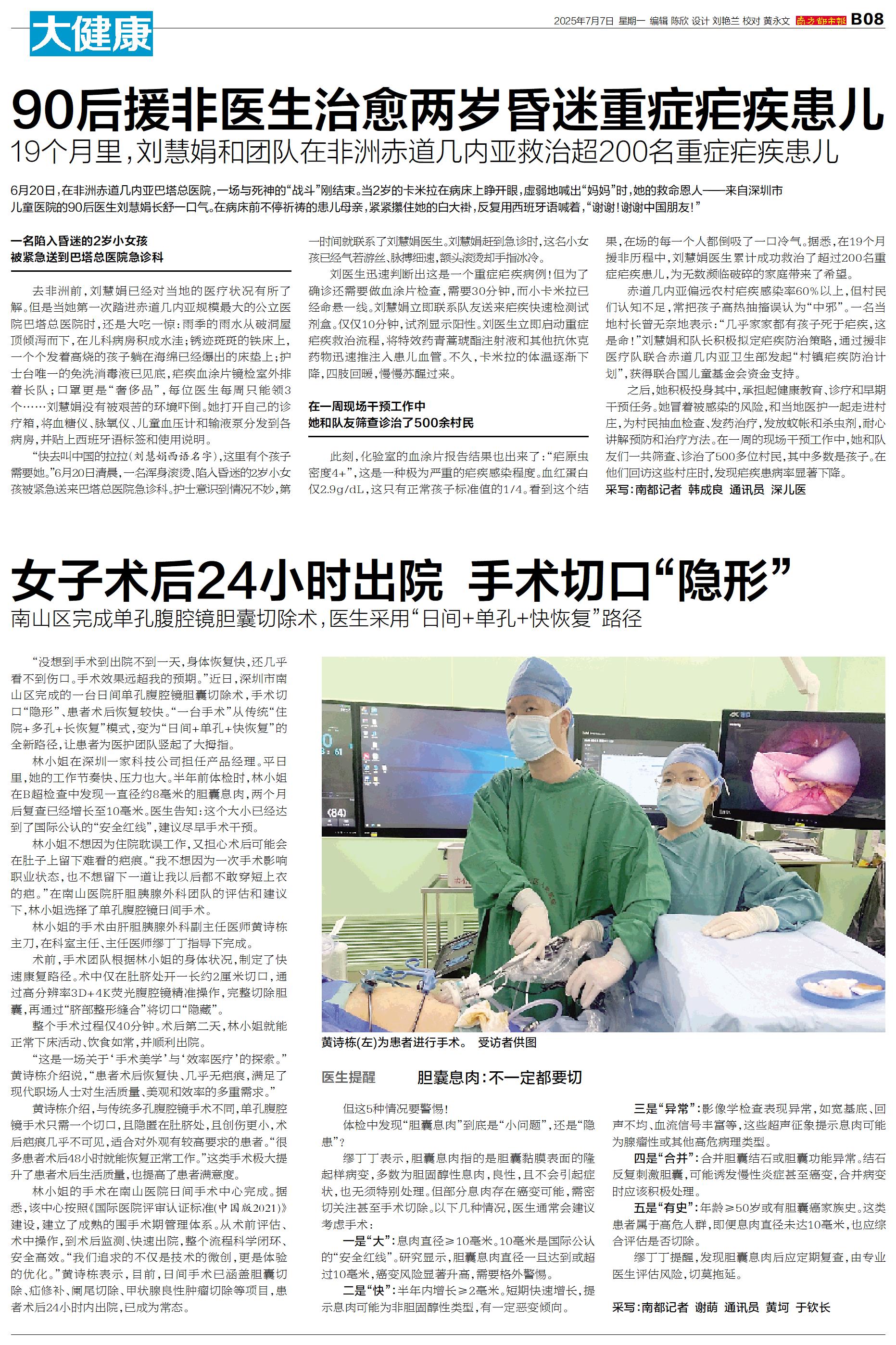 “没想到手术到出院不到一天,身体恢复快,还几乎看不到伤口。手术效果远超我的预期。”近日,深圳市南山区完成的一台日间单孔腹腔镜胆囊切除术,手术切口“隐形”、患者术后恢复较快。“一台手术”从传统“住院