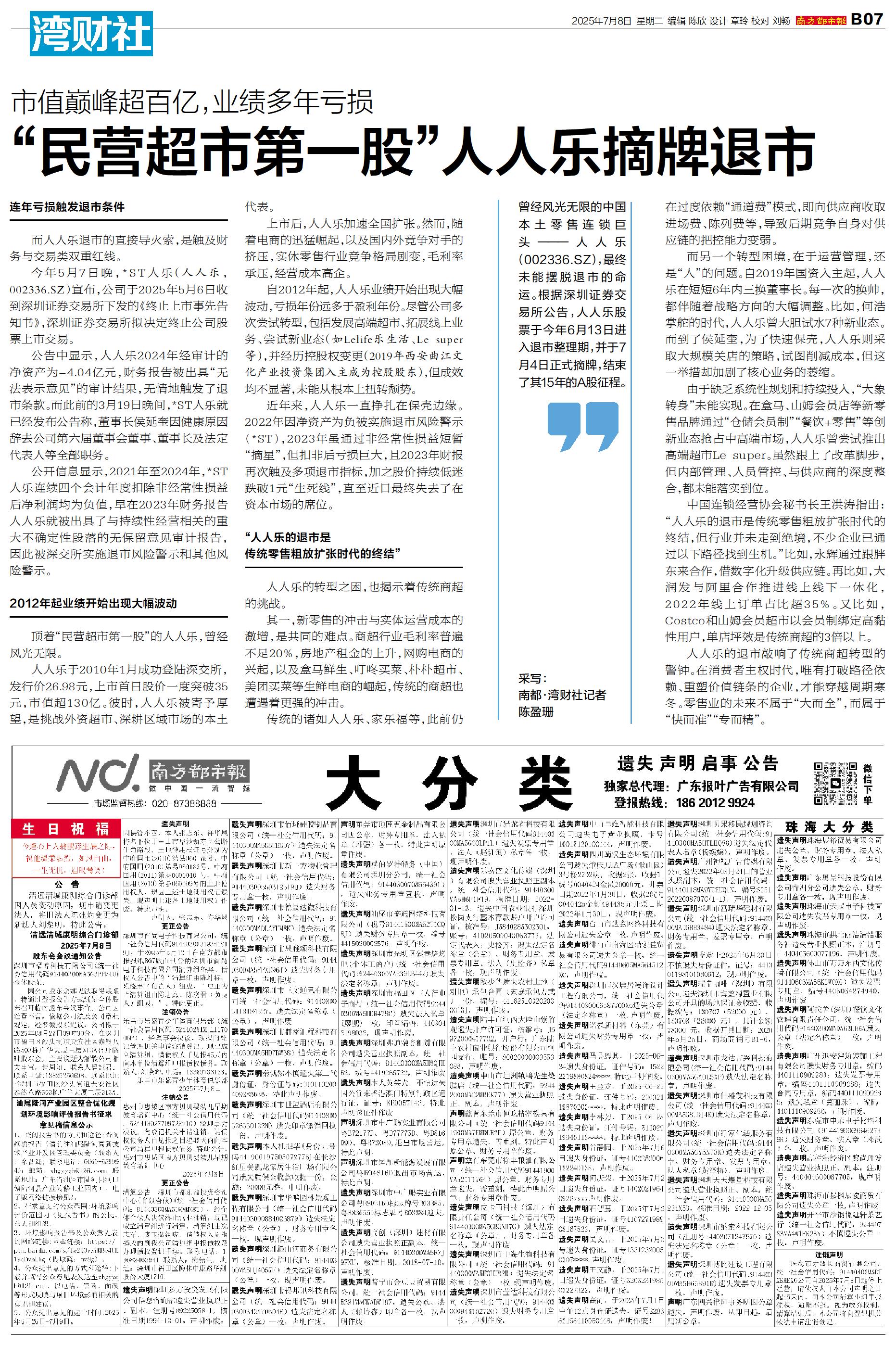 曾经风光无限的中国本土零售连锁巨头——人人乐(002336.SZ),最终未能摆脱退市的命运。根据深圳证券交易所公告,人人乐股票于今年6月13日进入退市整理期,并于7月4日正式摘牌,结束了其15年的