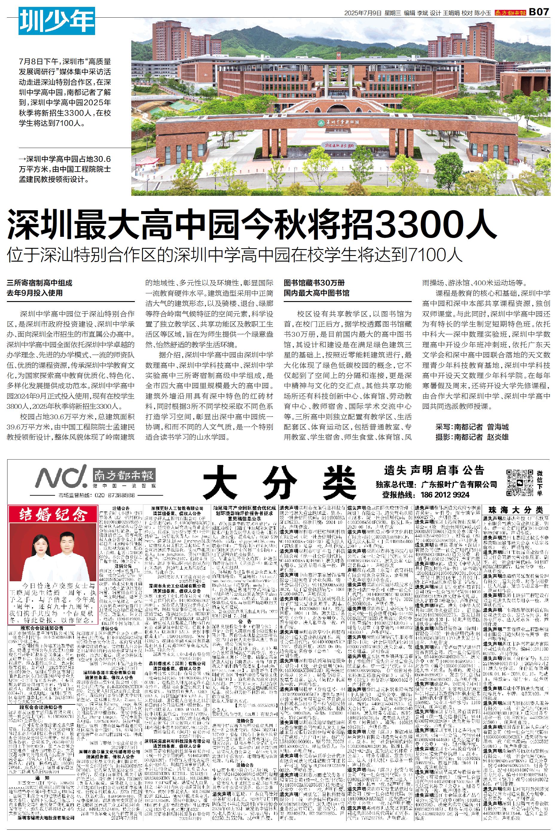 7月8日下午,深圳市“高质量发展调研行”媒体集中采访活动走进深汕特别合作区,在深圳中学高中园,南都记者了解到,深圳中学高中园2025年秋季将新招生3300人,在校学生将达到7100人。 三所寄宿