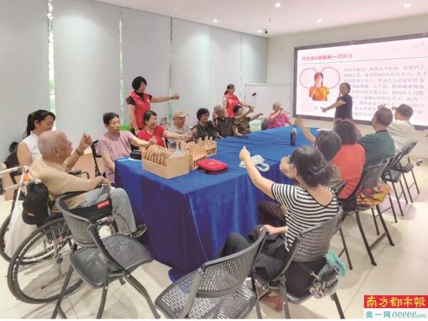 粤海街道蔚蓝海岸社区志愿者教老人做健脑操。
