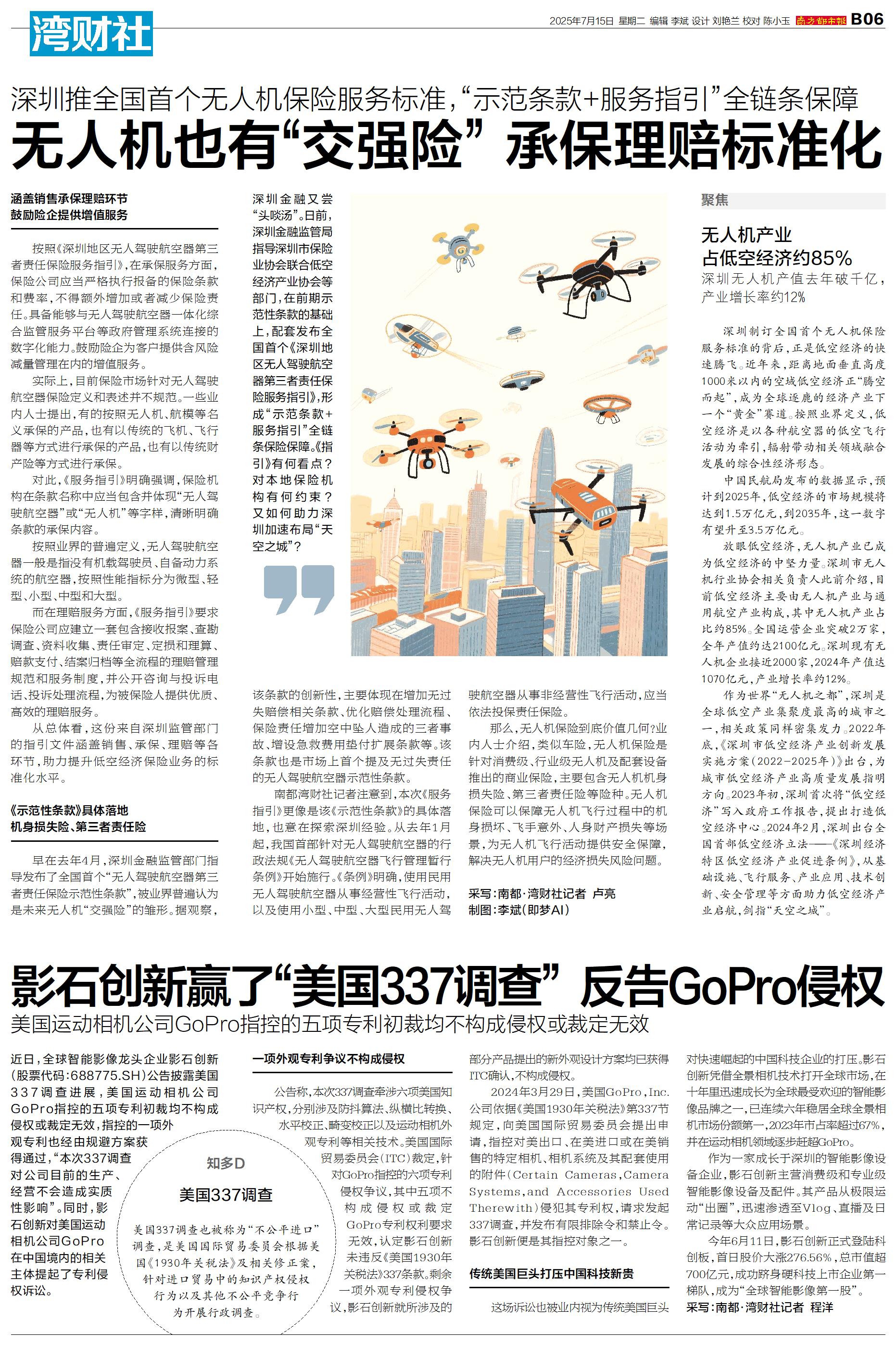 深圳金融又尝“头啖汤”。日前,深圳金融监管局指导深圳市保险业协会联合低空经济产业协会等部门,在前期示范性条款的基础上,配套发布全国首个《深圳地区无人驾驶航空器第三者责任保险服务指引》,形成“示范条