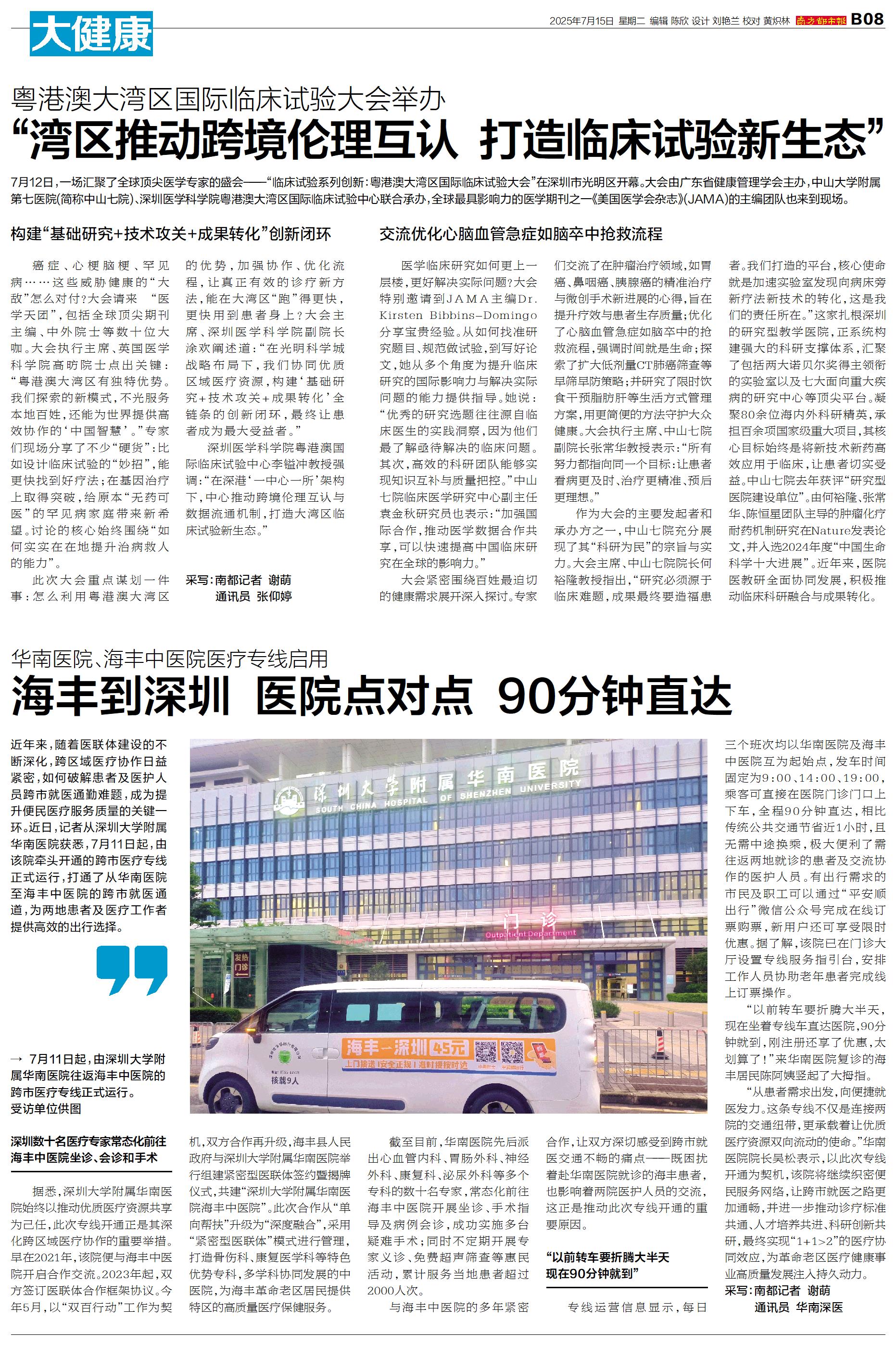 近年来,随着医联体建设的不断深化,跨区域医疗协作日益紧密,如何破解患者及医护人员跨市就医通勤难题,成为提升便民医疗服务质量的关键一环。近日,记者从深圳大学附属华南医院获悉,7月11日起,由该院牵头