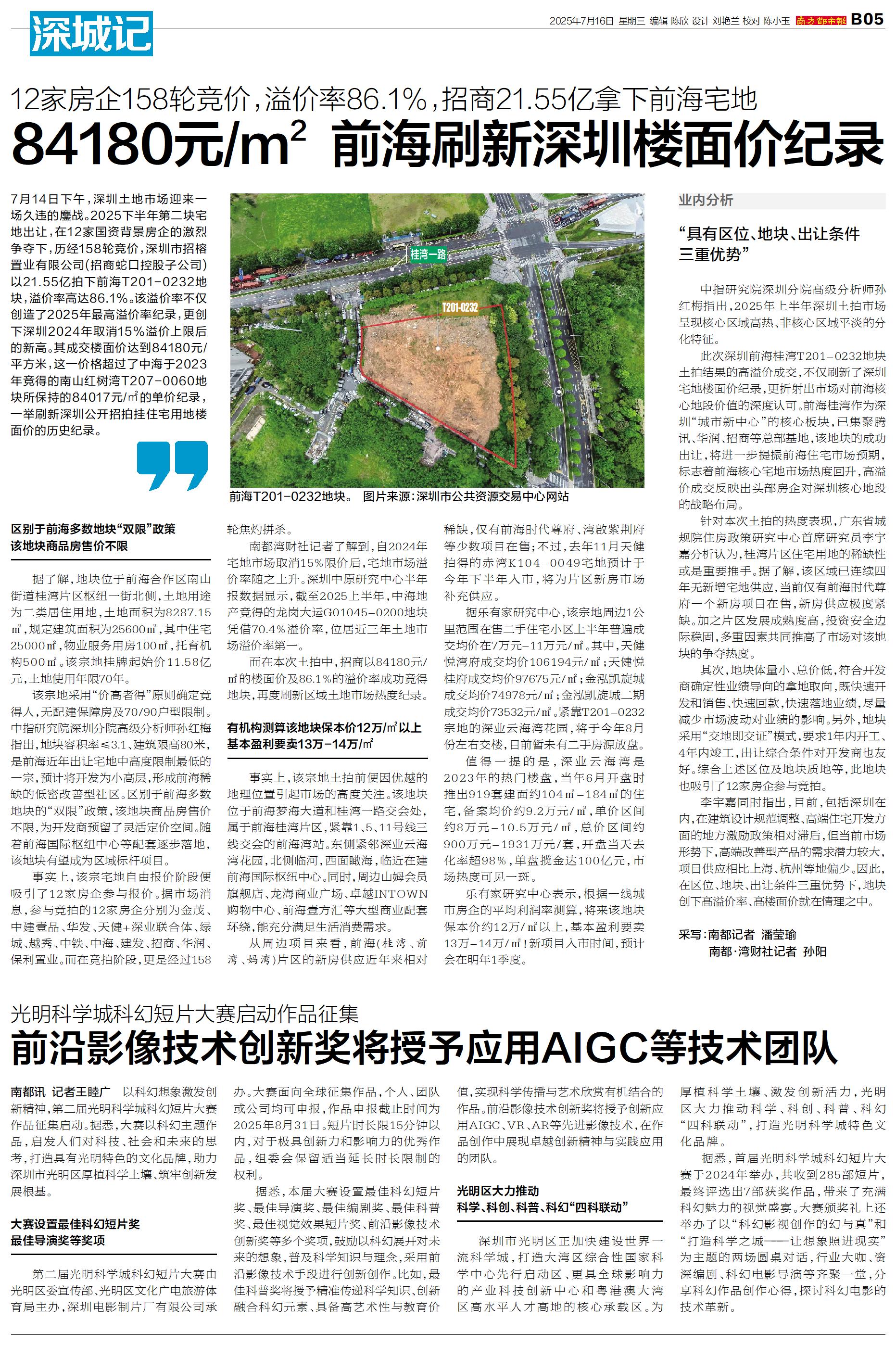 7月14日下午,深圳土地市场迎来一场久违的鏖战。2025下半年第二块宅地出让,在12家国资背景房企的激烈争夺下,历经158轮竞价,深圳市招榕置业有限公司(招商蛇口控股子公司)以21.55亿拍下前海T201-0232地块,溢价率高达86.1%。该溢价率不仅创造了2025年最高溢价率纪录,更创下深圳2024年取消15%溢价上限后的新高。其成交楼面价达到84180元/平方米,这一价格超过了中海于2023年竞得的南山红树湾T207-0060地块所保持的84017元/㎡的单价纪录,一举刷新深圳公开招拍挂住宅用地楼面价的历史纪录。
