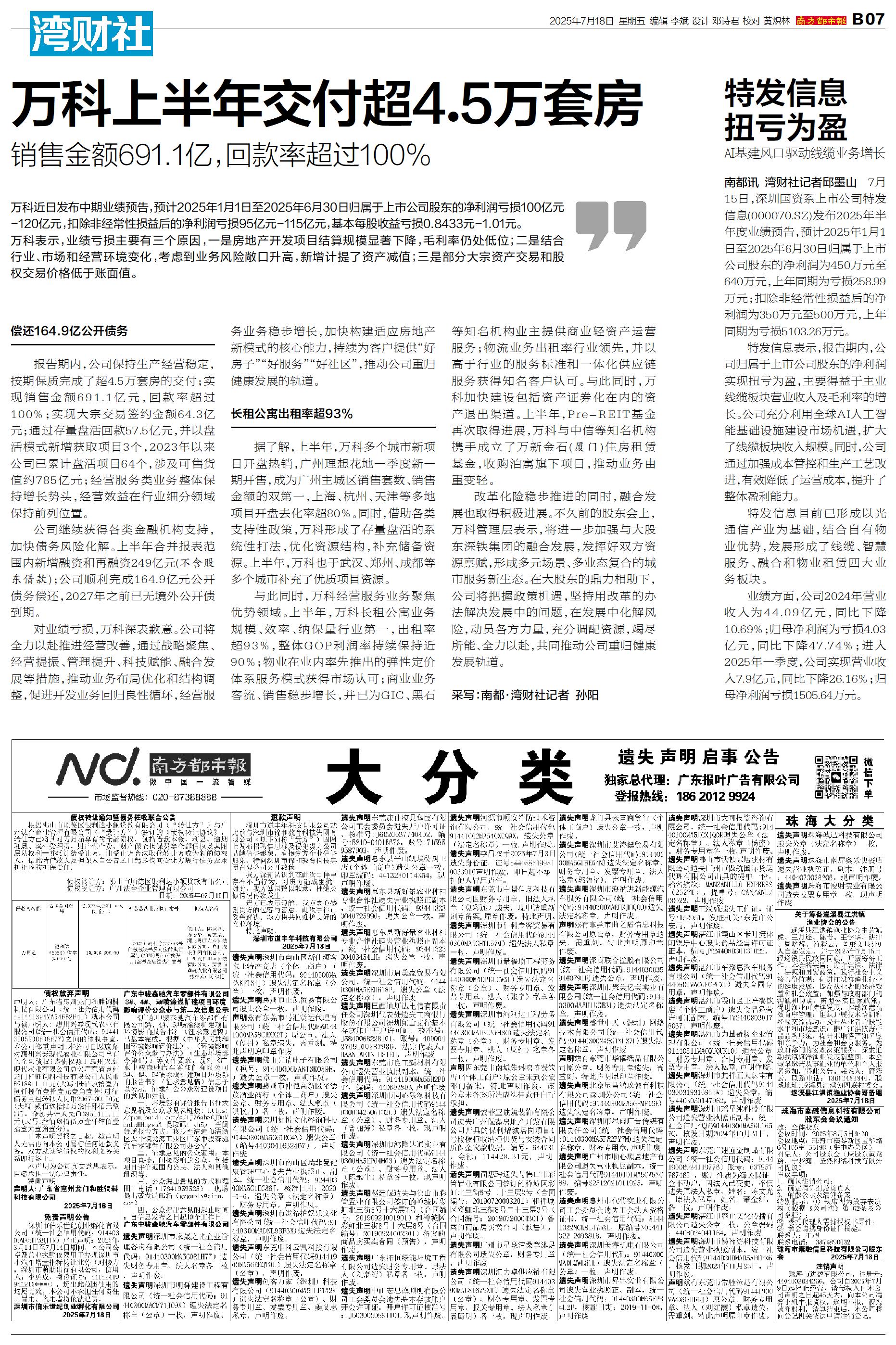 南都讯 湾财社记者邱墨山 7月15日,深圳国资系上市公司特发信息(000070.SZ)发布2025年半年度业绩预告,预计2025年1月1日至2025年6月30日归属于上市公司股东的净利润为450万元至640万元,上年同期为亏损258.99万元;扣除非经常性损益后的净利润为350万元至500万元,上年同期为亏损5103.26万元。