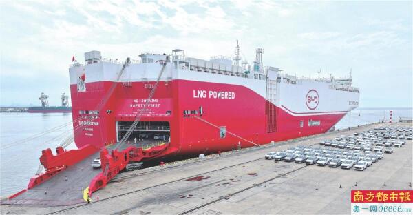 7月18日,刚刚完成试航并正式交付的比亚迪“郑州号”在深圳市深汕特别合作区小漠国际物流港(简称“小漠港”)开启新船首航,1064辆比亚迪新能源汽车有序登船,后续将在宁波港“接力”汽车装船,最终驶向东南亚。