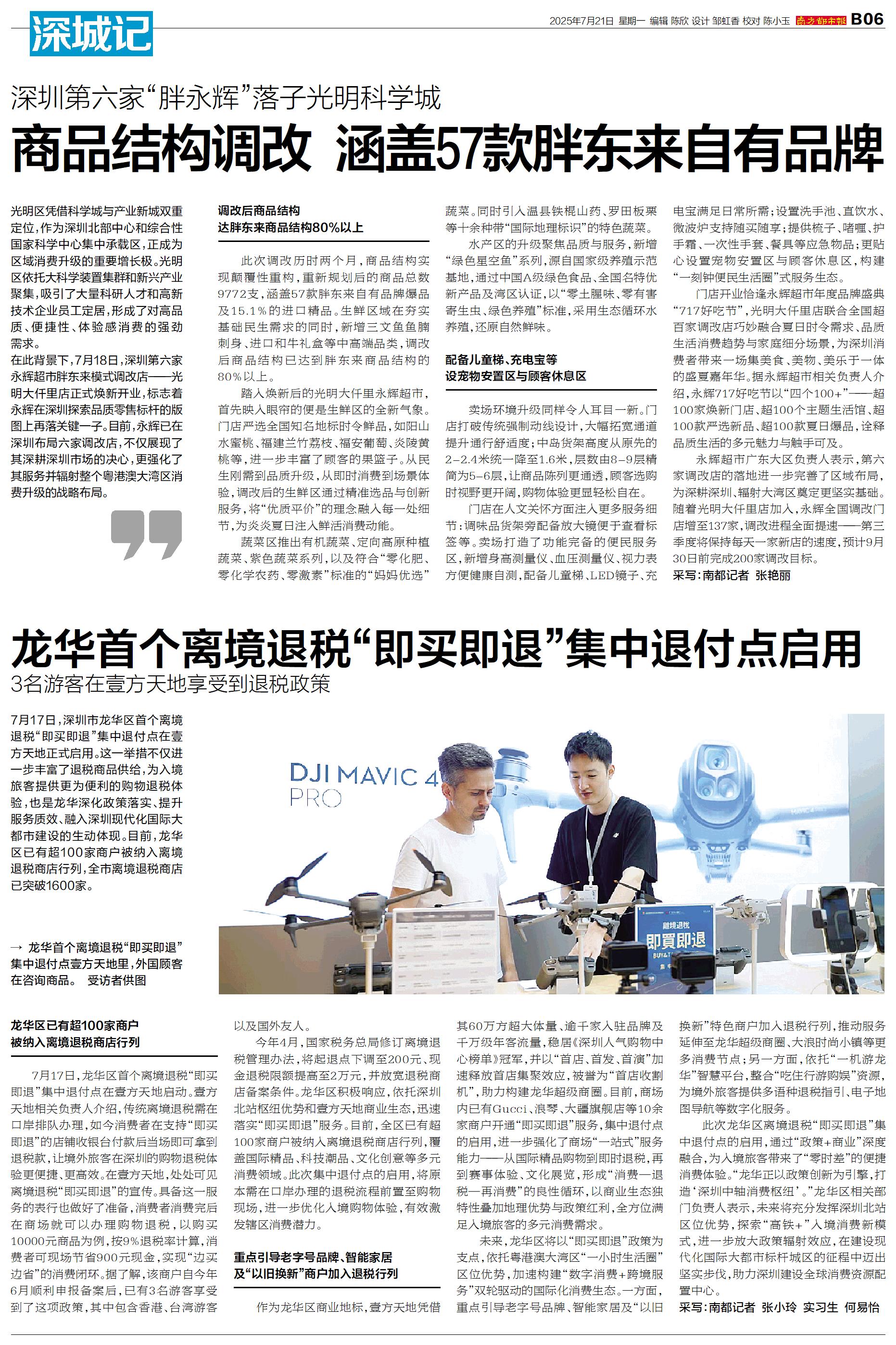 7月17日,深圳市龙华区首个离境退税“即买即退”集中退付点在壹方天地正式启用。这一举措不仅进一步丰富了退税商品供给,为入境旅客提供更为便利的购物退税体验,也是龙华深化政策落实、提升服务质效、融入深圳现代化国际大都市建设的生动体现。目前,龙华区已有超100家商户被纳入离境退税商店行列,全市离境退税商店已突破1600家。